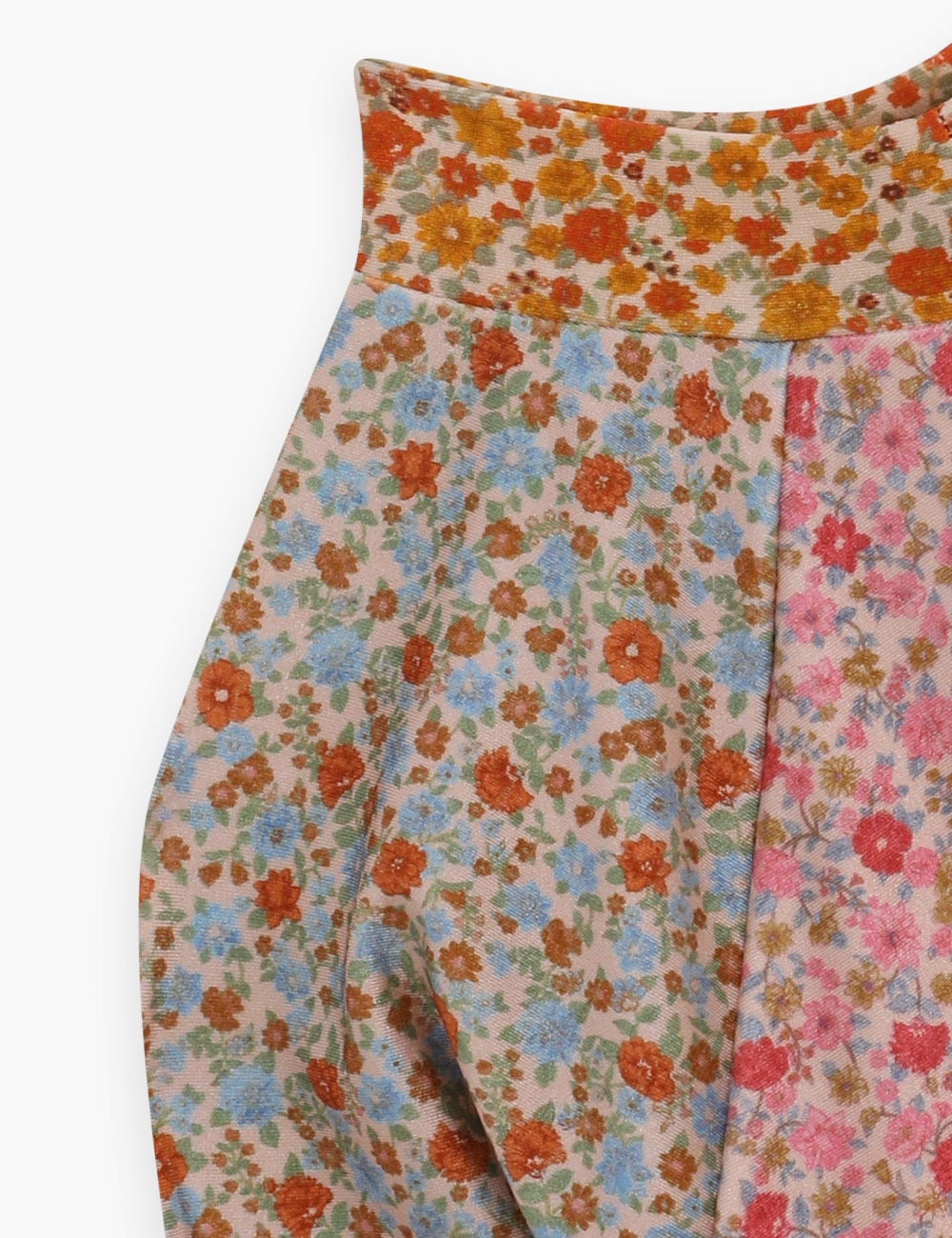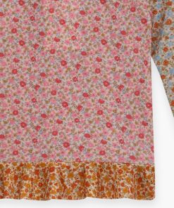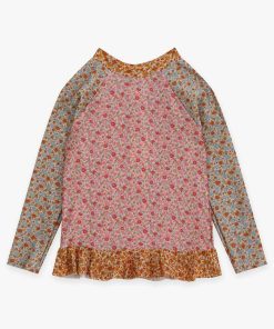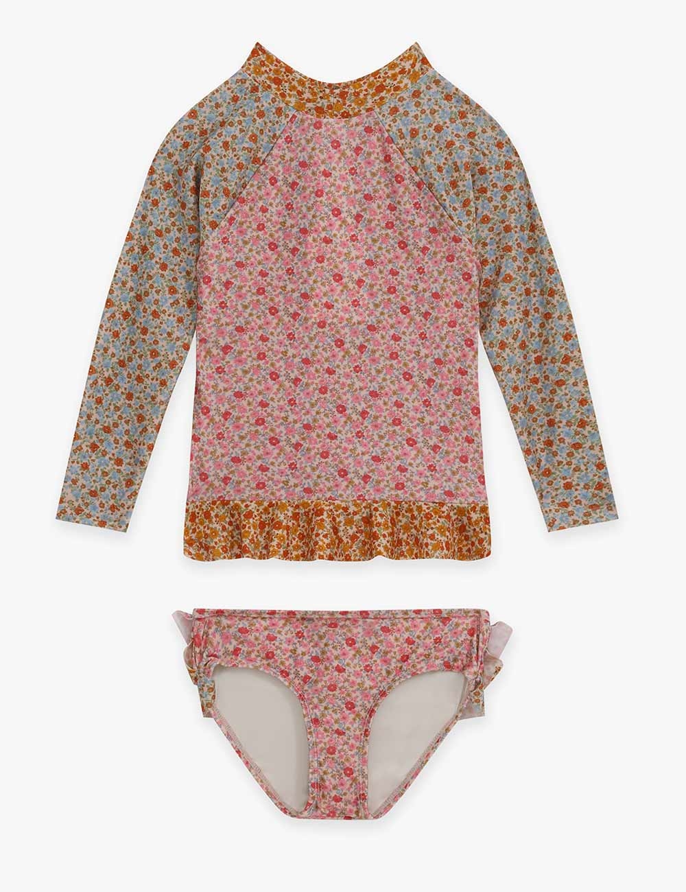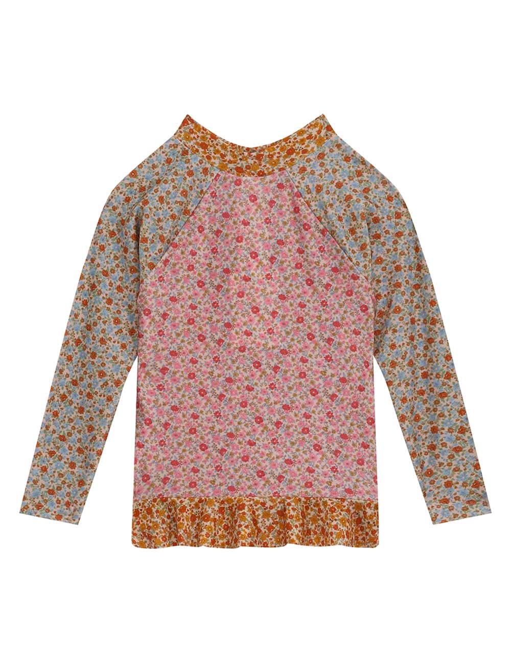 The Lucky Kids Frill Rashie in Spliced from our Summer Swim 2025 Collection. A long sleeve rash shirt featuring raglan shoulders and playful frill hem. long sleeve rash shirt, raglan shoulders, frill hem, round neckline, contrasting pattern