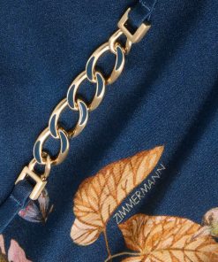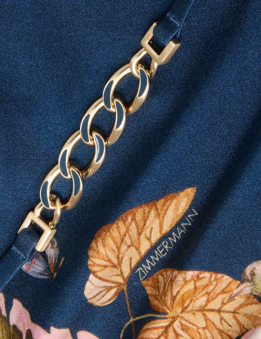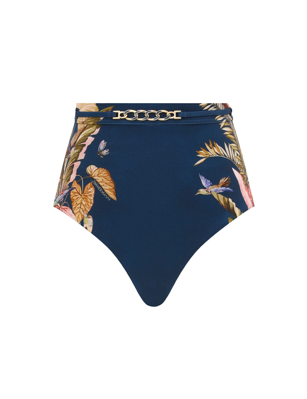 The Ascension High Waist Pant in Dark Blue Palm Floral from our Summer Swim 2025 Collection. A high waisted bikini pant constructed from form-fitting lycra featuring a low legline, finished with a chain belt at the waist.shiny lycra high waist pant, built in belt at waist with chain detailing and loops, full bottom coverage, lined, pant only, bra sold separately