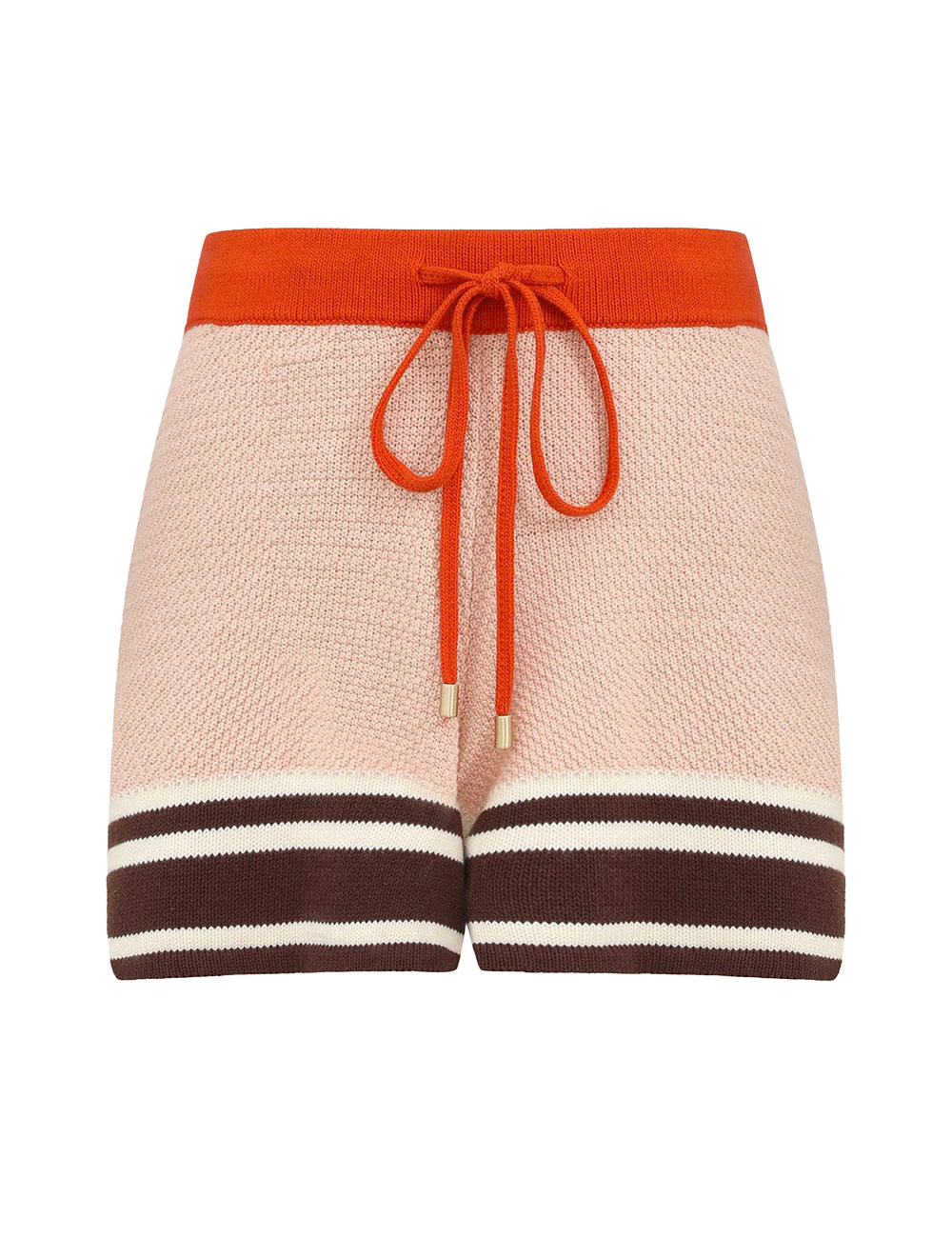 The Ascension Stripe Knit Short in Stripe from our Summer Swim 2025 Collection. A knitted mini short featuring contrast hem and elasticated waistband with drawstring cord and toggles.knit short, elastic waist for a flexible fit