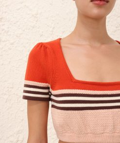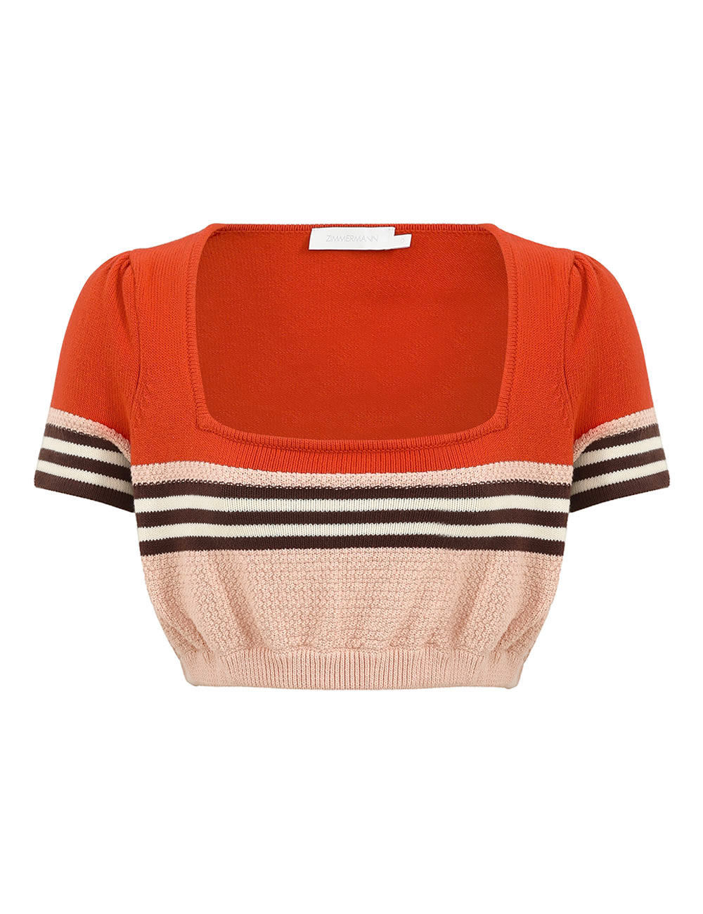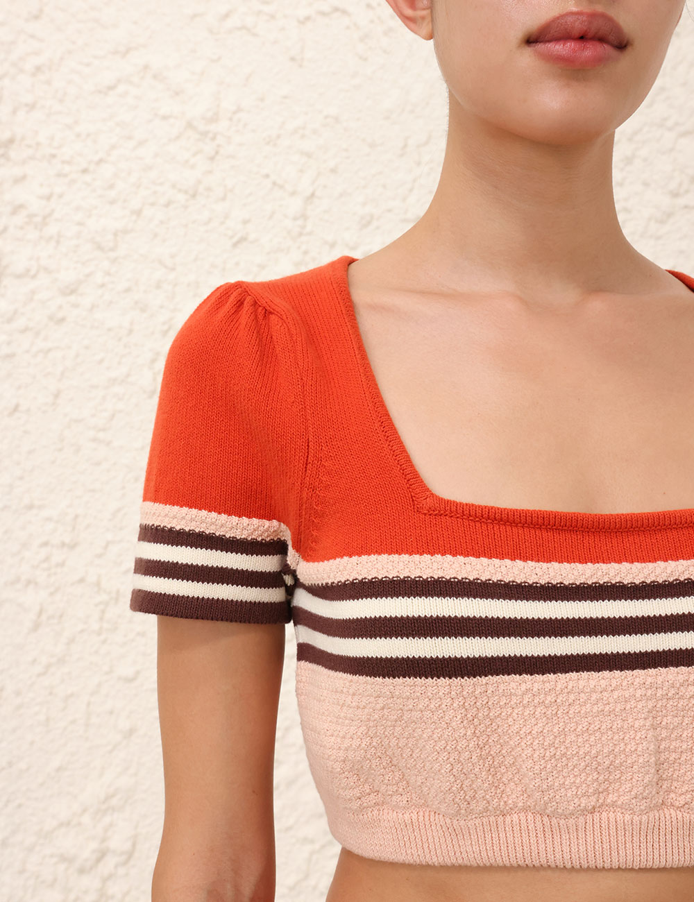 The Ascension Stripe Knit Top in Stripe from our Summer Swim 2025 Collection. A cropped knit top featuring a square neckline, short sleeves and a gathered waist. knit top, short sleeves, elasticated waistband