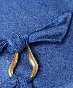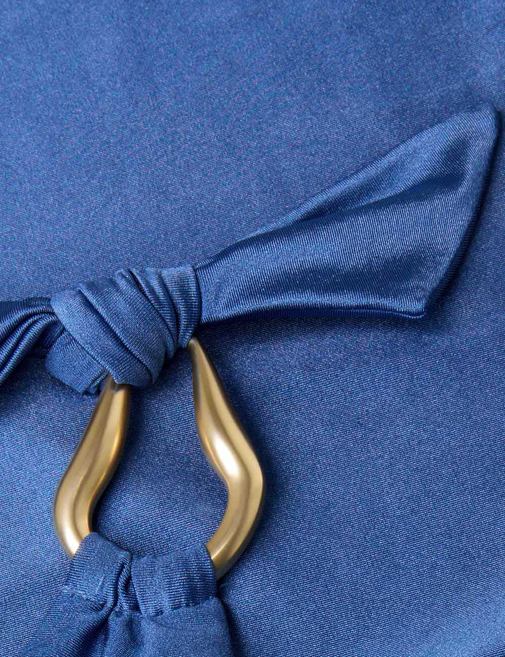 The Ascension Trim 1PC in Mid Blue from our Summer Swim 2025 Collection. A lycra one piece featuring a knot strap with gold detailing at the shoulder and adjustable strap.shiny lycra one piece, one shoulder knot feature, full coverage bottom, lined