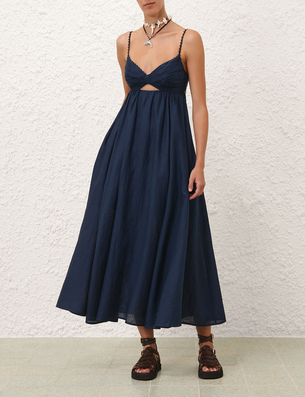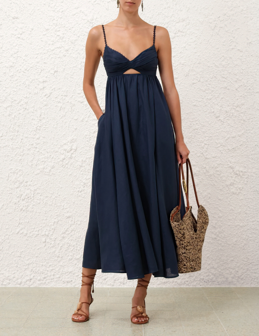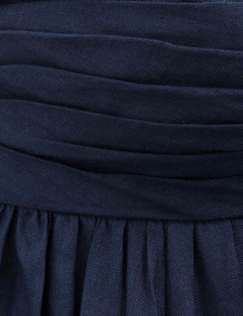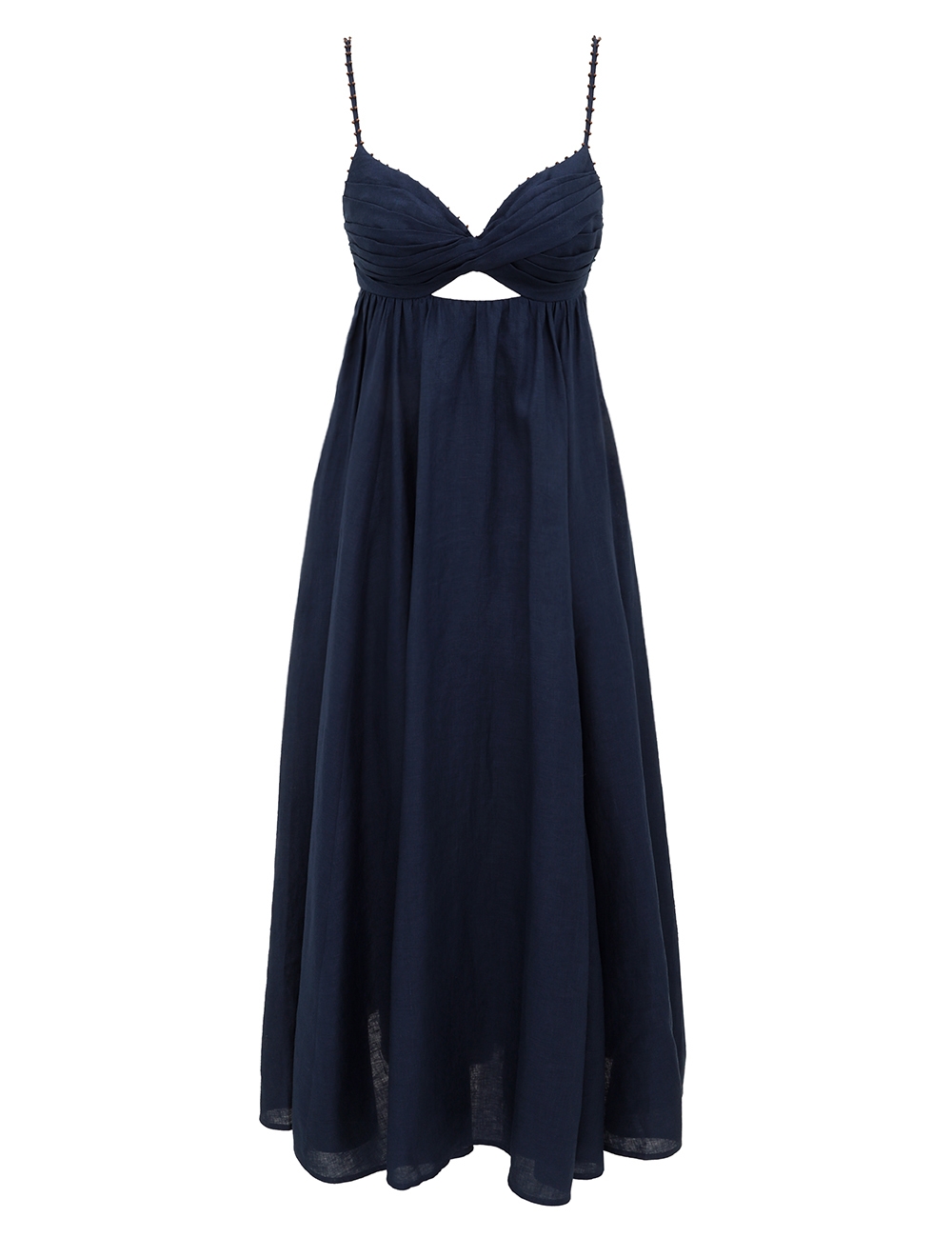 The Ascension Twist Front Dress in Dark Blue from our Summer Swim 2025 Collection. A linen midi dress featuring a sweetheart neckline, twist front feature detail and wooden bead detailing on the straps, finished with a pleated drop style skirt.100% linen fabric, adjustable straps with wooden beaded trim, shirred elastic across back, hook and bar closure, scooped lower back, boning in the bodice , invisible zip closure at lower back