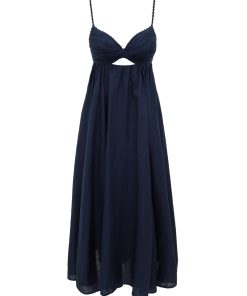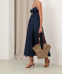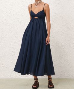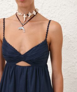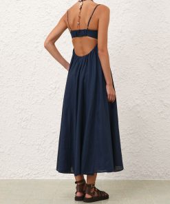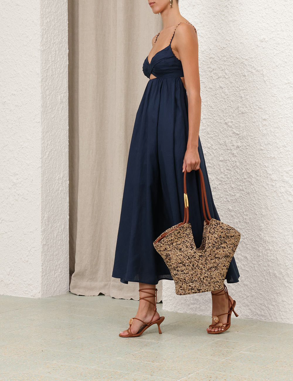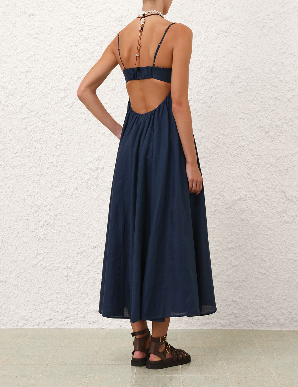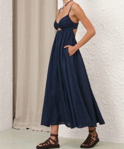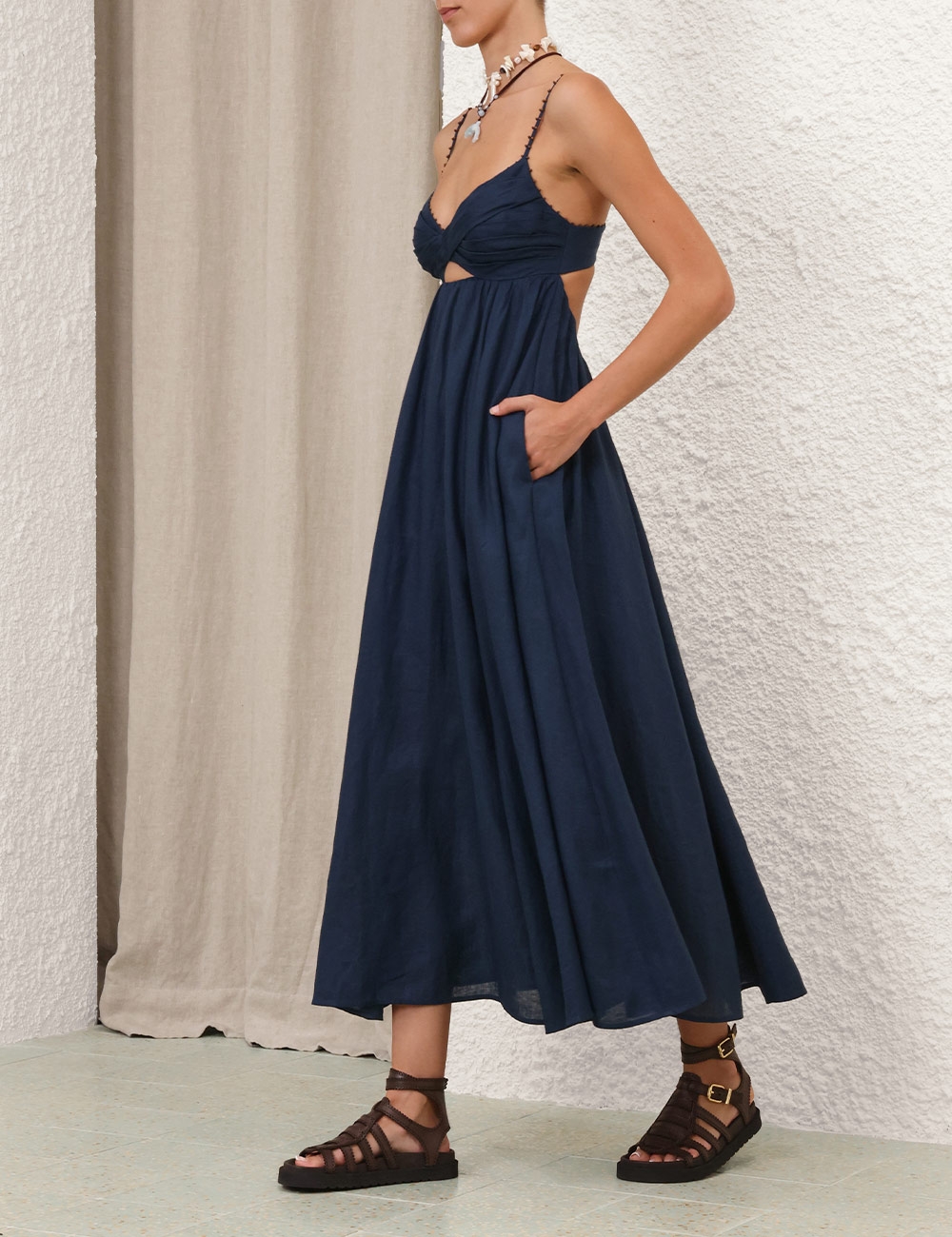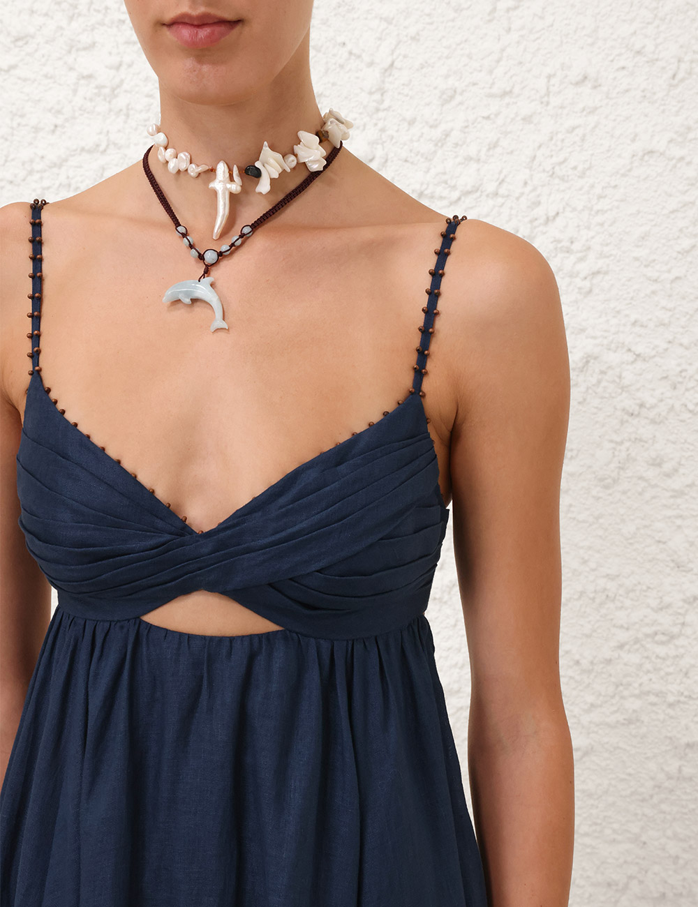 The Ascension Twist Front Dress in Dark Blue from our Summer Swim 2025 Collection. A linen midi dress featuring a sweetheart neckline, twist front feature detail and wooden bead detailing on the straps, finished with a pleated drop style skirt.100% linen fabric, adjustable straps with wooden beaded trim, shirred elastic across back, hook and bar closure, scooped lower back, boning in the bodice , invisible zip closure at lower back