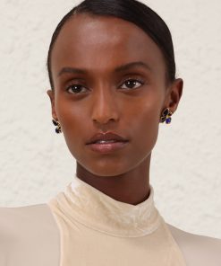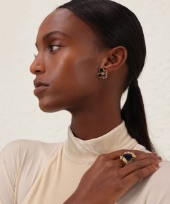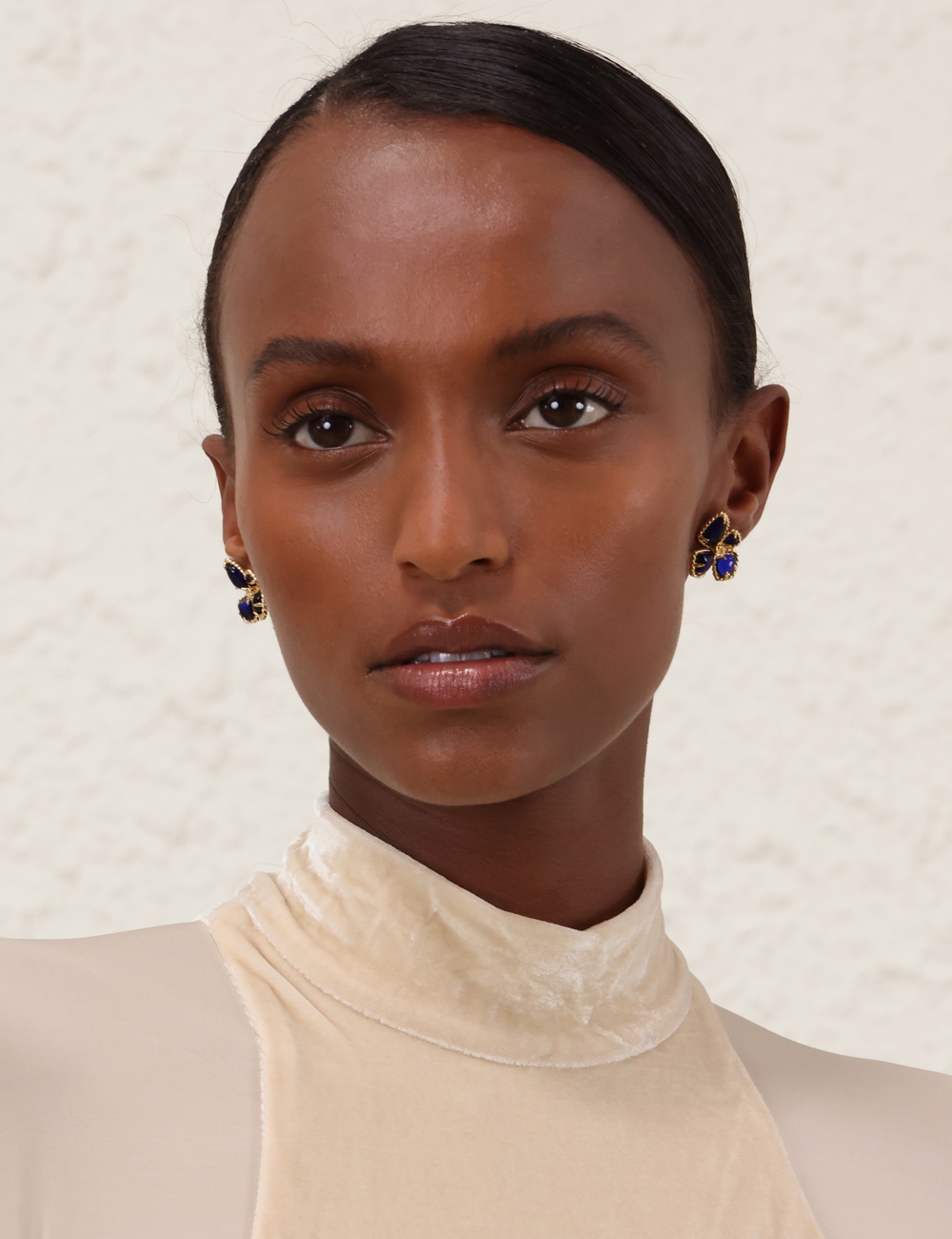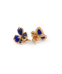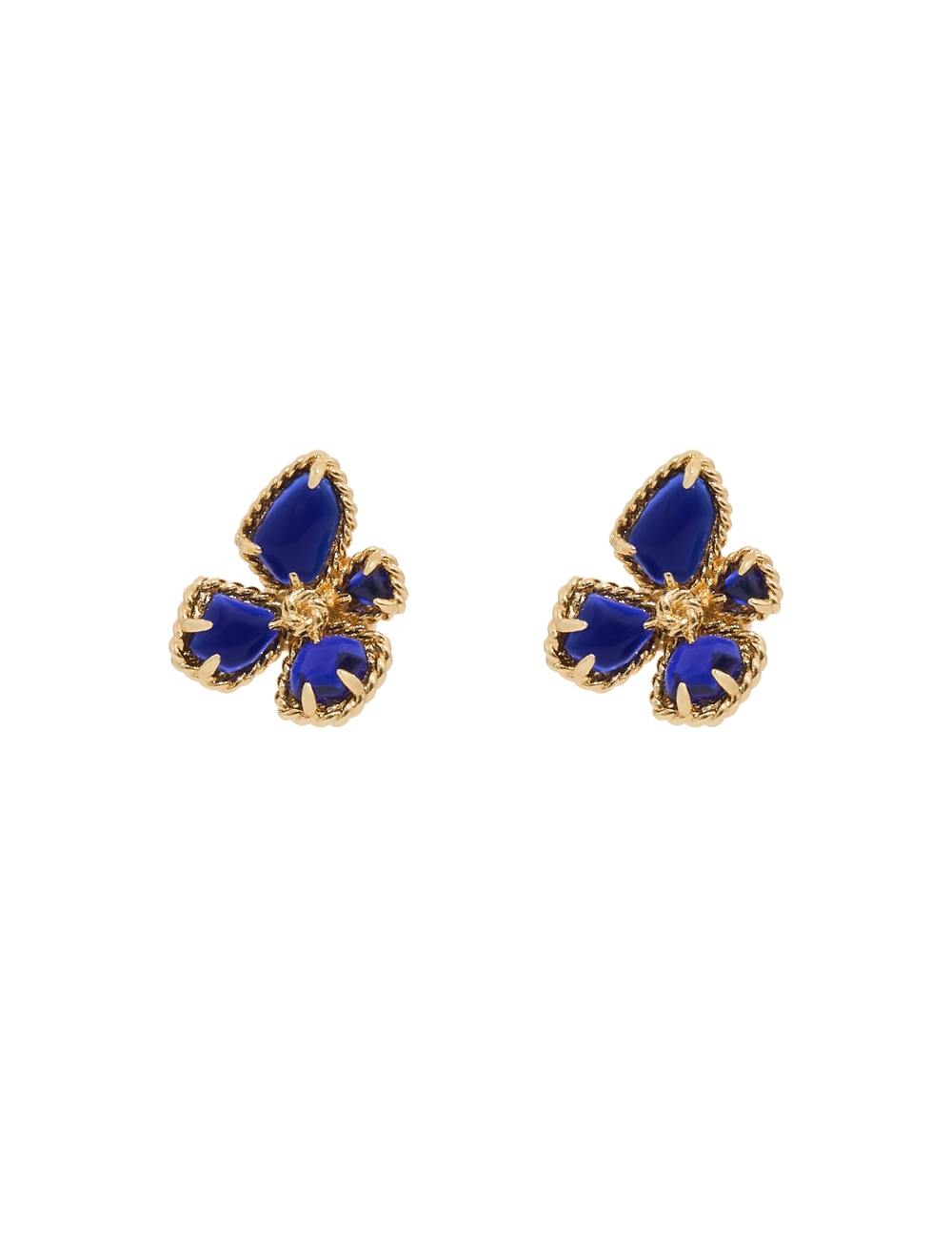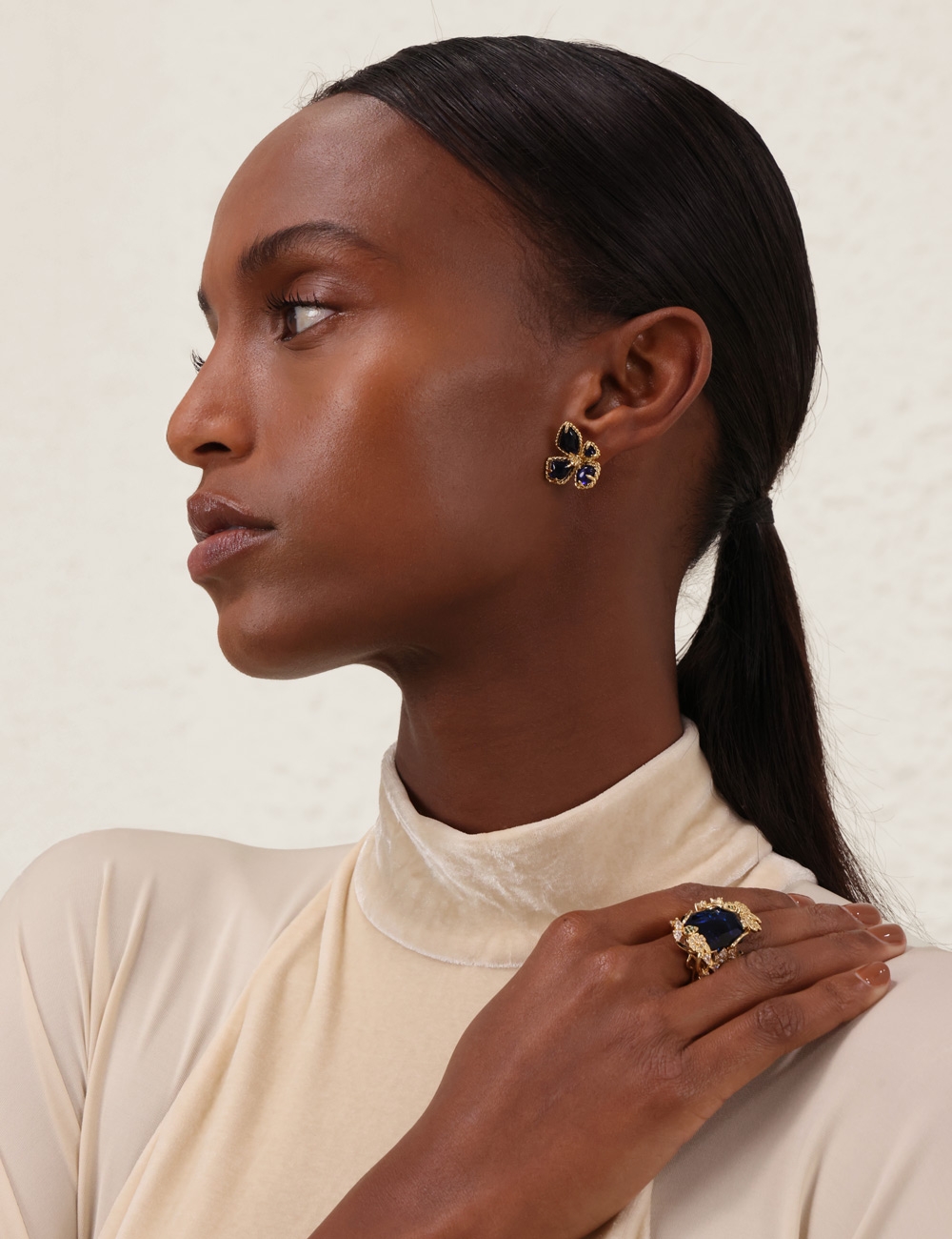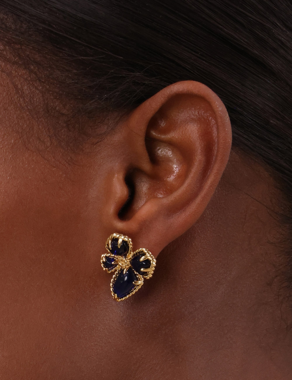 The Bloom Large Studs in Gold/Blue from our Fall 2025 Collection, Hypnotic. A large gold plated stud earring featuring Glass Sapphire stones set in a floral design.12kt gold plated stud earrings, glass sapphire floral stones, sold as a pair