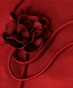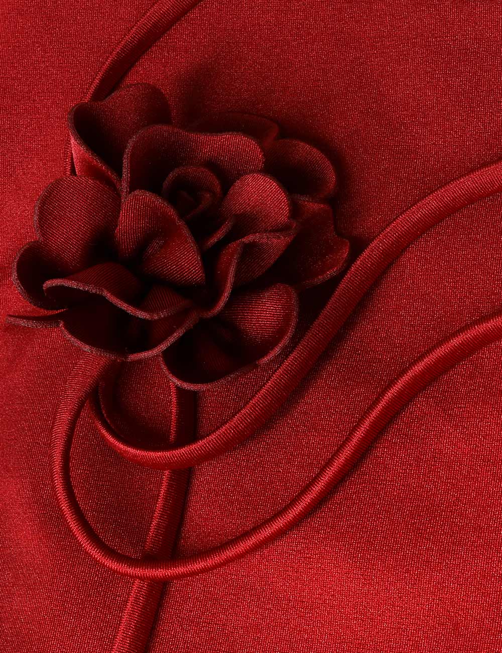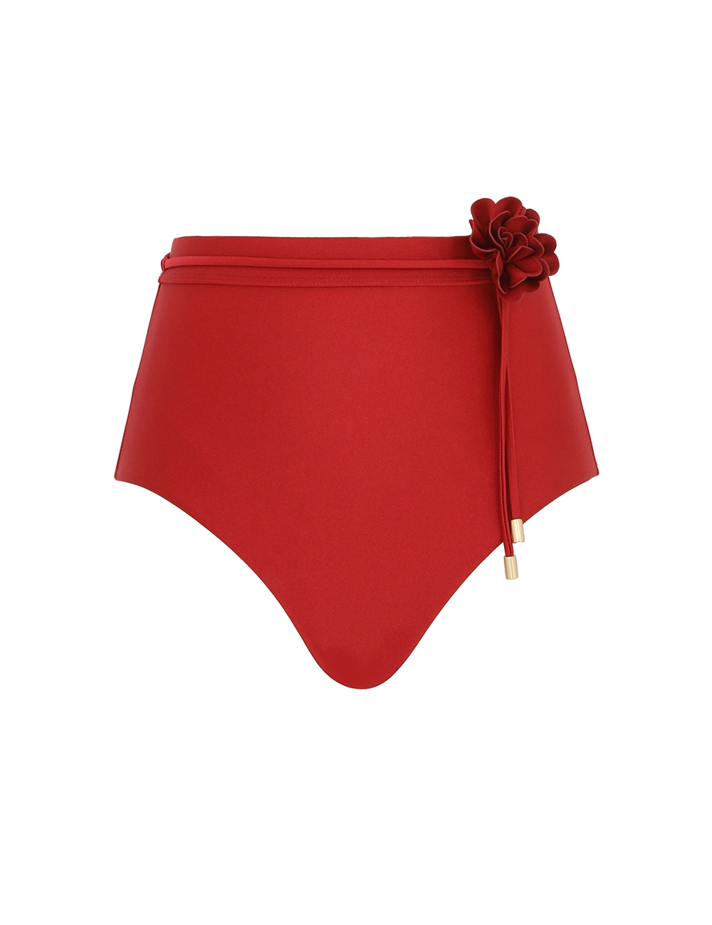 The Cascadian Flower Bikini High Pant in Dark Red from our Summer Swim 2025 Collection. A shiny lycra high waisted bikini bottom featuring a waist tie belt with flower feature and toggle ends.rouleau belt loops with gold accents, removable self-tie at waist with flower at left hand side, maximum coverage, lined, pant only, bra sold separately