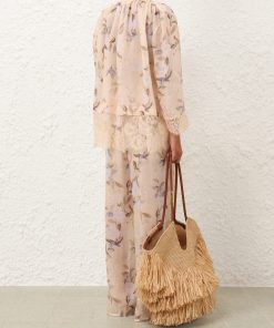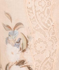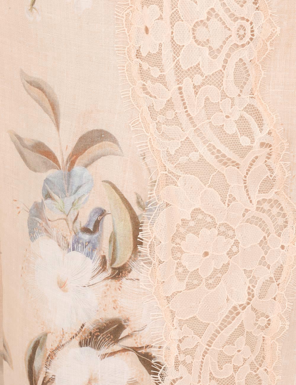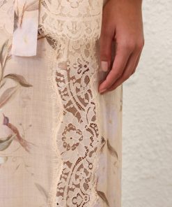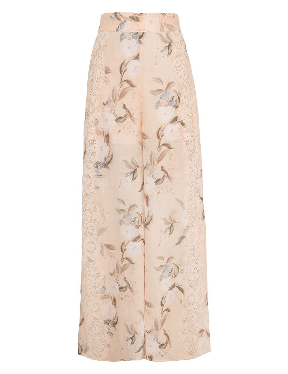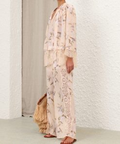 The Cascadian Lace Trimmed Pant in Cream Botanical Floral from our Summer Swim 2025 Collection. A ramie pant featuring an elasticated waistband and lace detailing.100% ramie fabric, full-length pant, lace trim along sides, invisible band waist with elasticated back, short lining underneath