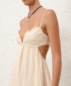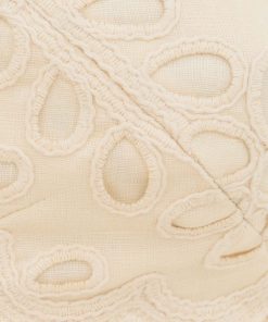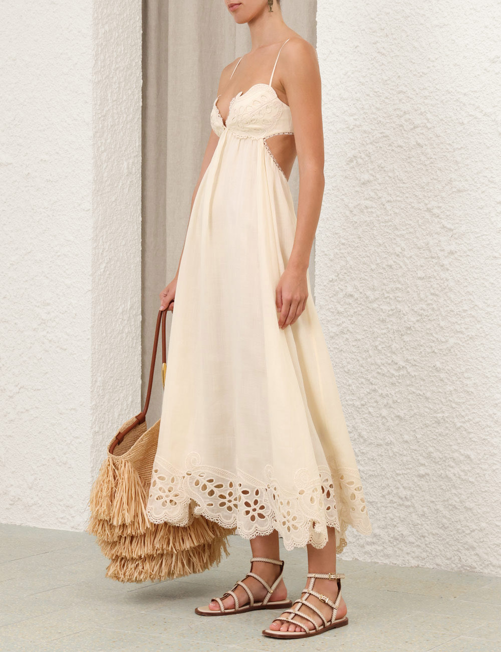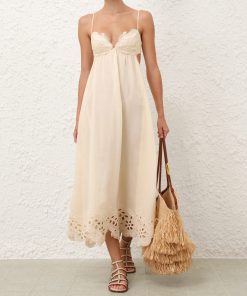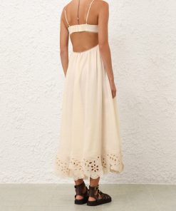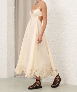 The Coco Embroidered Dress in Cream from our Summer Swim 2025 Collection. A ramie maxi dress featuring embroidery detail throughout, a V-neckline and a shirred back, finished with a gathered waist. 100% ramie fabric, scalloped lace trim, adjustable shoulder straps, shirred elastic across the back with hook and eye closure, invisible zip at scooped lower back, skirt is lined
