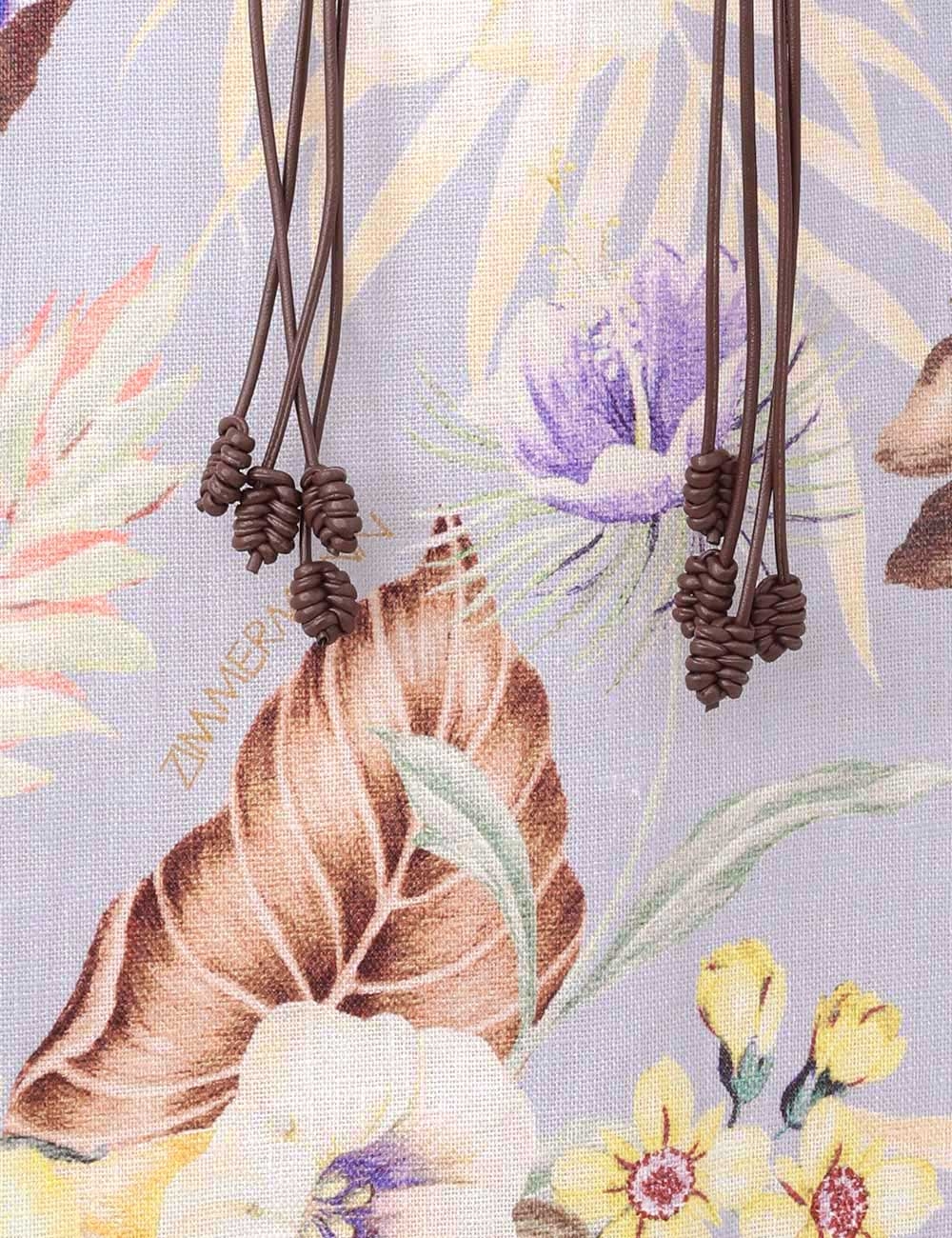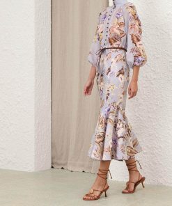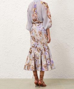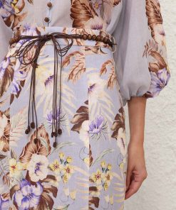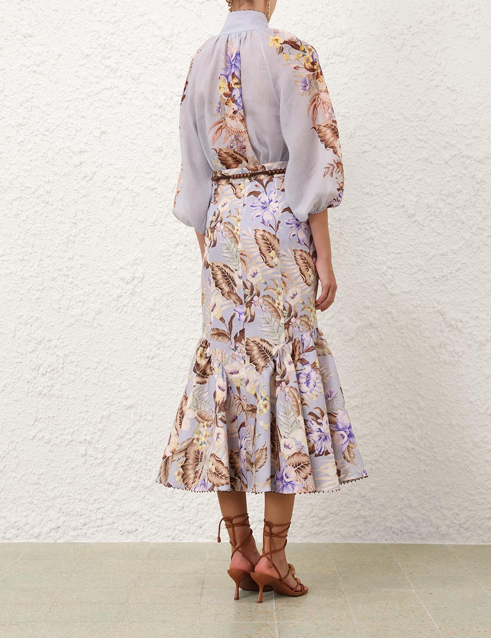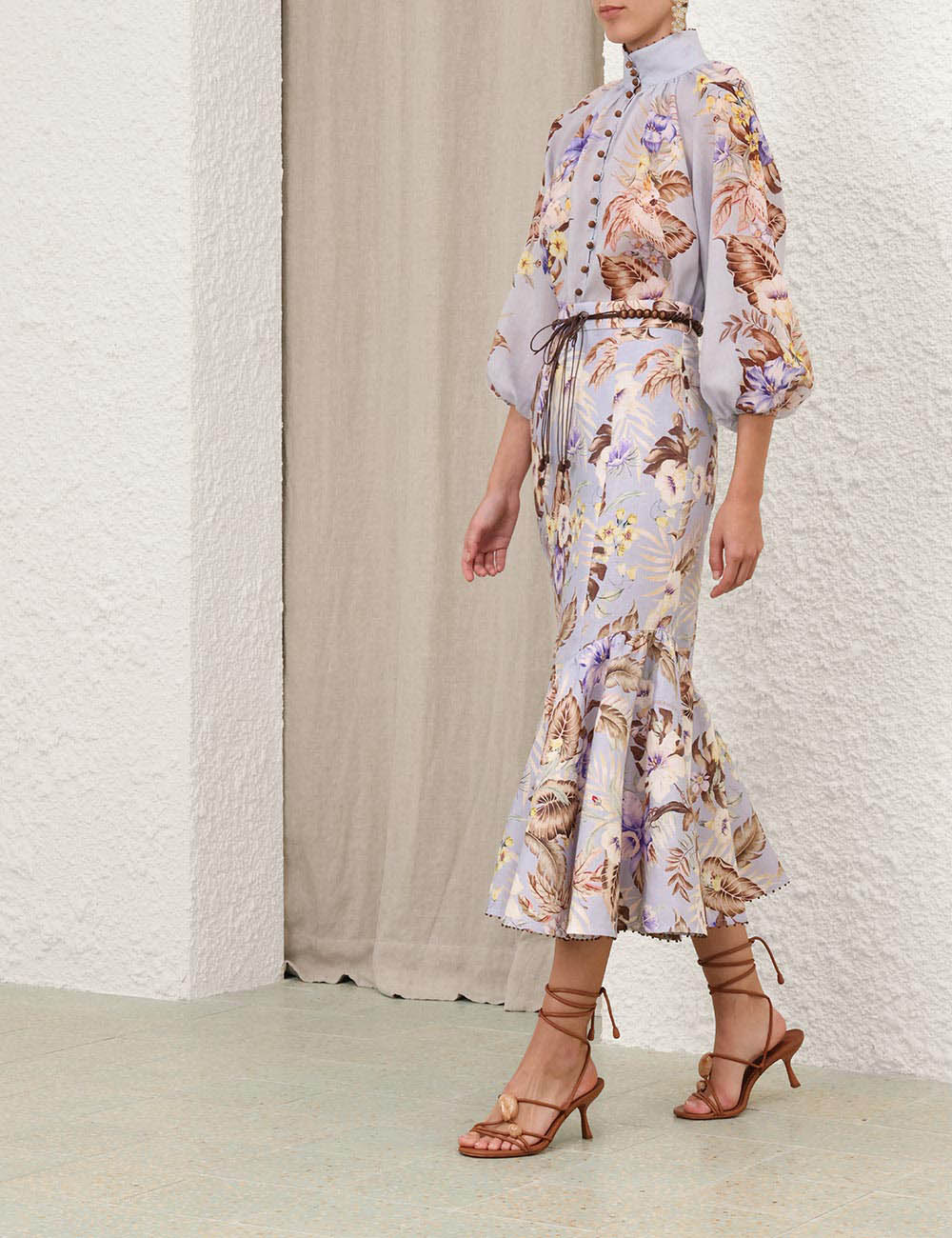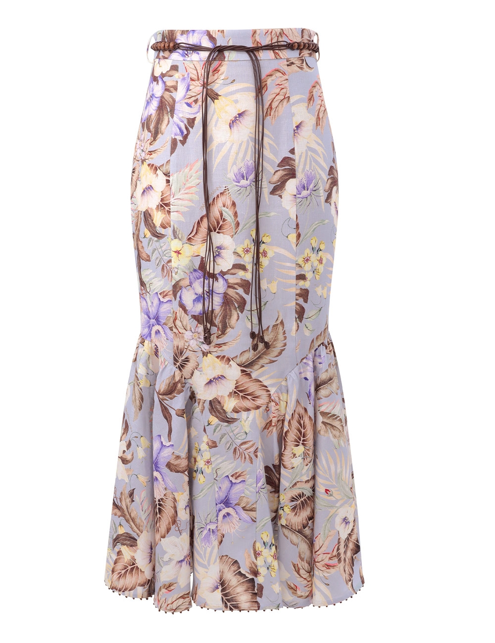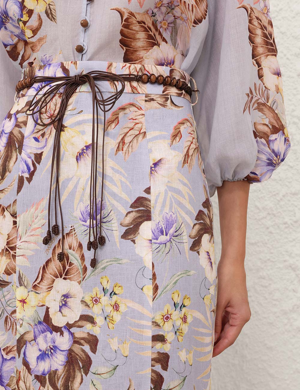 The Coco Fit and Flare Midi Skirt in Powder Blue Multi Floral from our Summer Swim 2025 Collection. A fitted linen midi skirt featuring a removable waist belt and frill detailing at the hem, finished with a wooden bead edge trim.100% linen fabric, fitted skirt with panel seams at the front and back, removable wooden beaded belt, invisible zip at centre back with hook and eye, gather side hem frills, unlined skirt