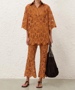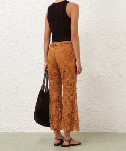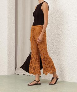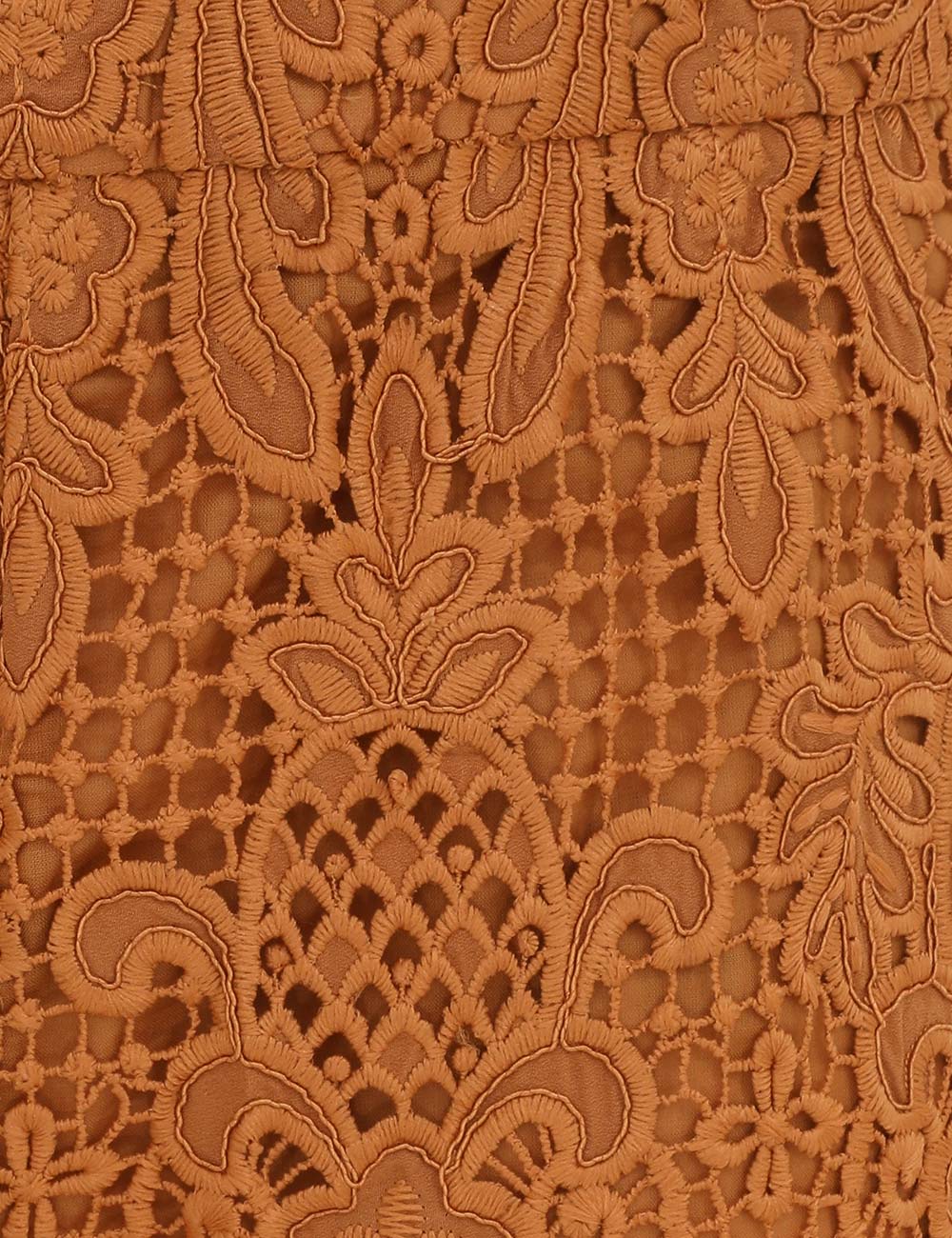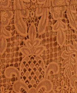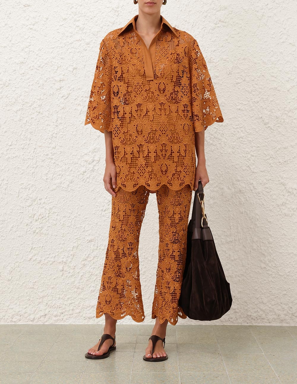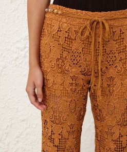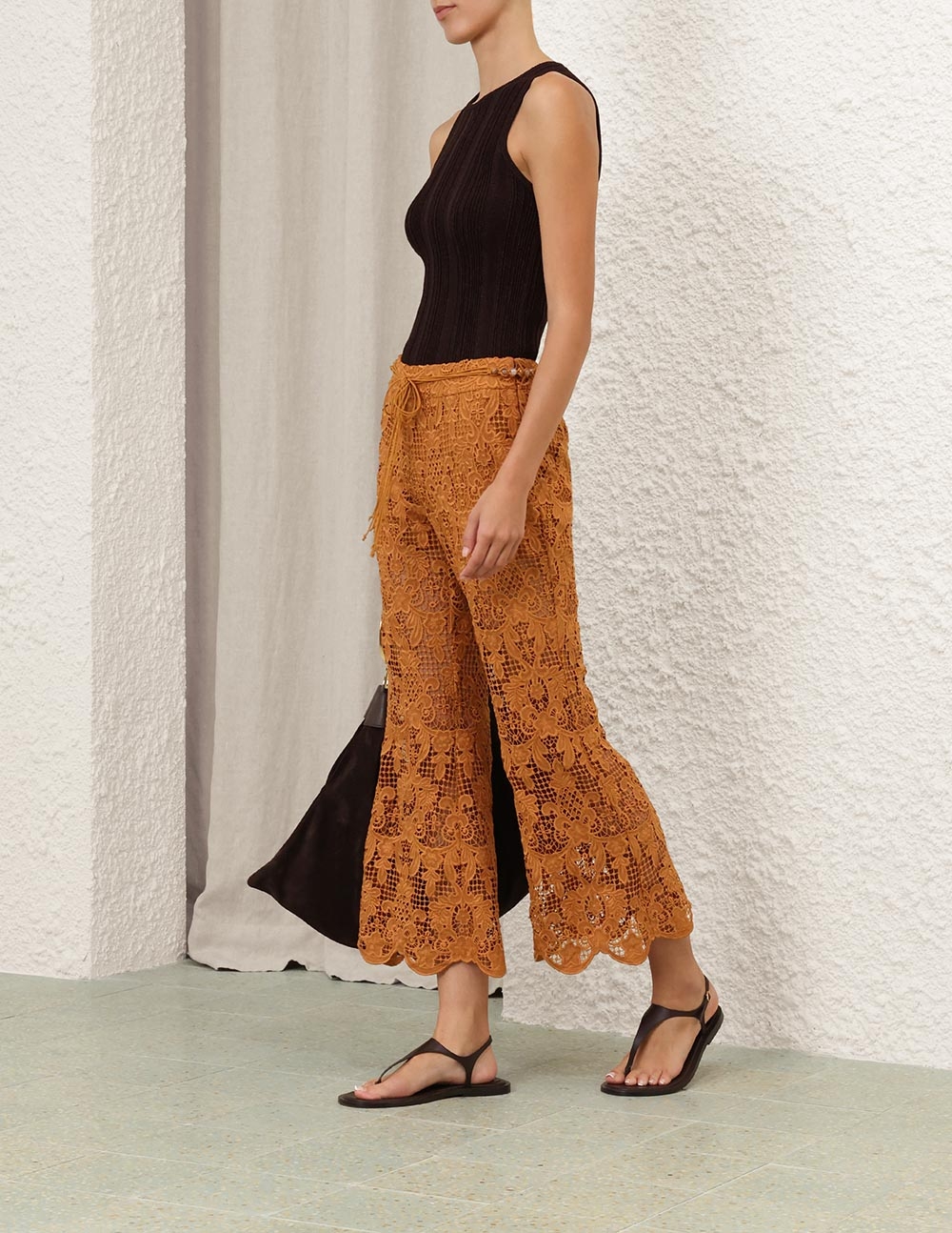 The Coco Lace Flare Pant in Biscuit from our Summer Swim 2025 Collection. A lace, mid-rise pant featuring a flared silhouette and a self tie beaded belt, finished with scalloped edging.mid-rise lace pant, fixed waistband, large scallops at hem, invisible zip at left side, pant is fully lined up to short length