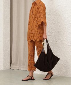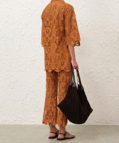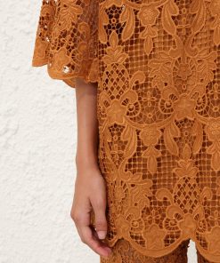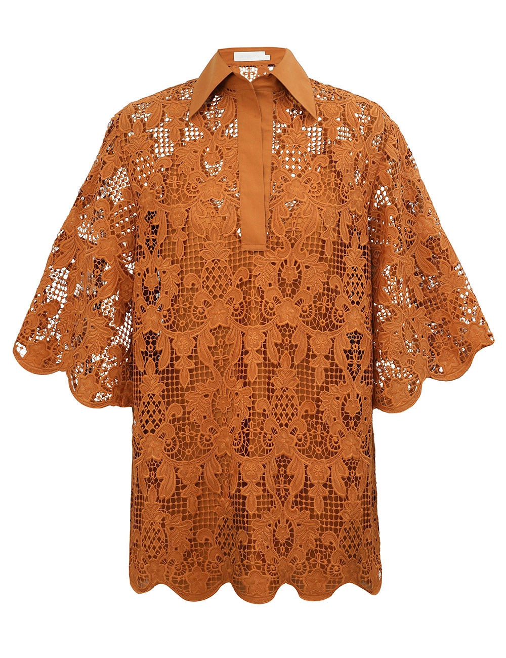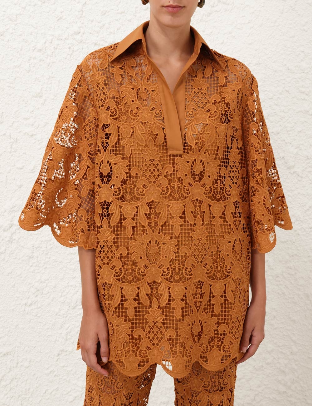 The Coco Lace Tunic Top in Biscuit from our Summer Swim 2025 Collection. A lace top featuring a classic collar, V-neckline, scalloped edges and loose sleeves.lace tunic top, quarter-length loose sleeves with wide cuffs, scalloped edges at the cuffs and hems, comes with separate cami