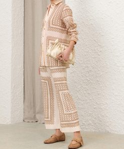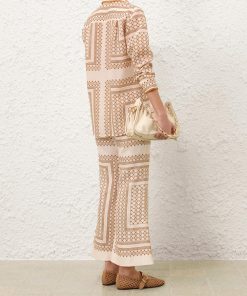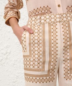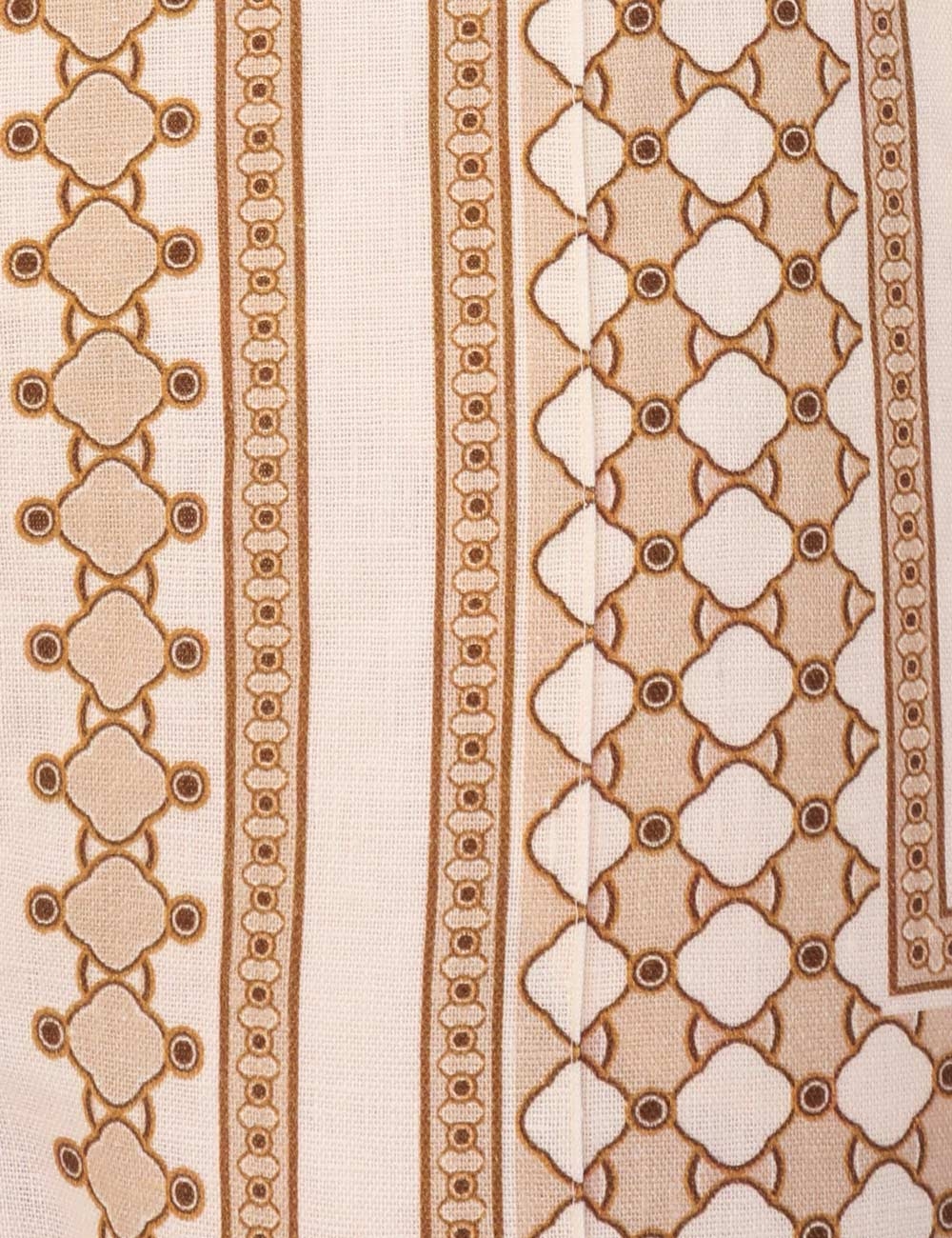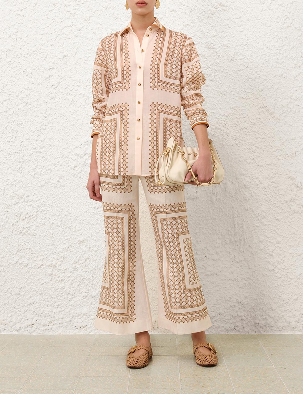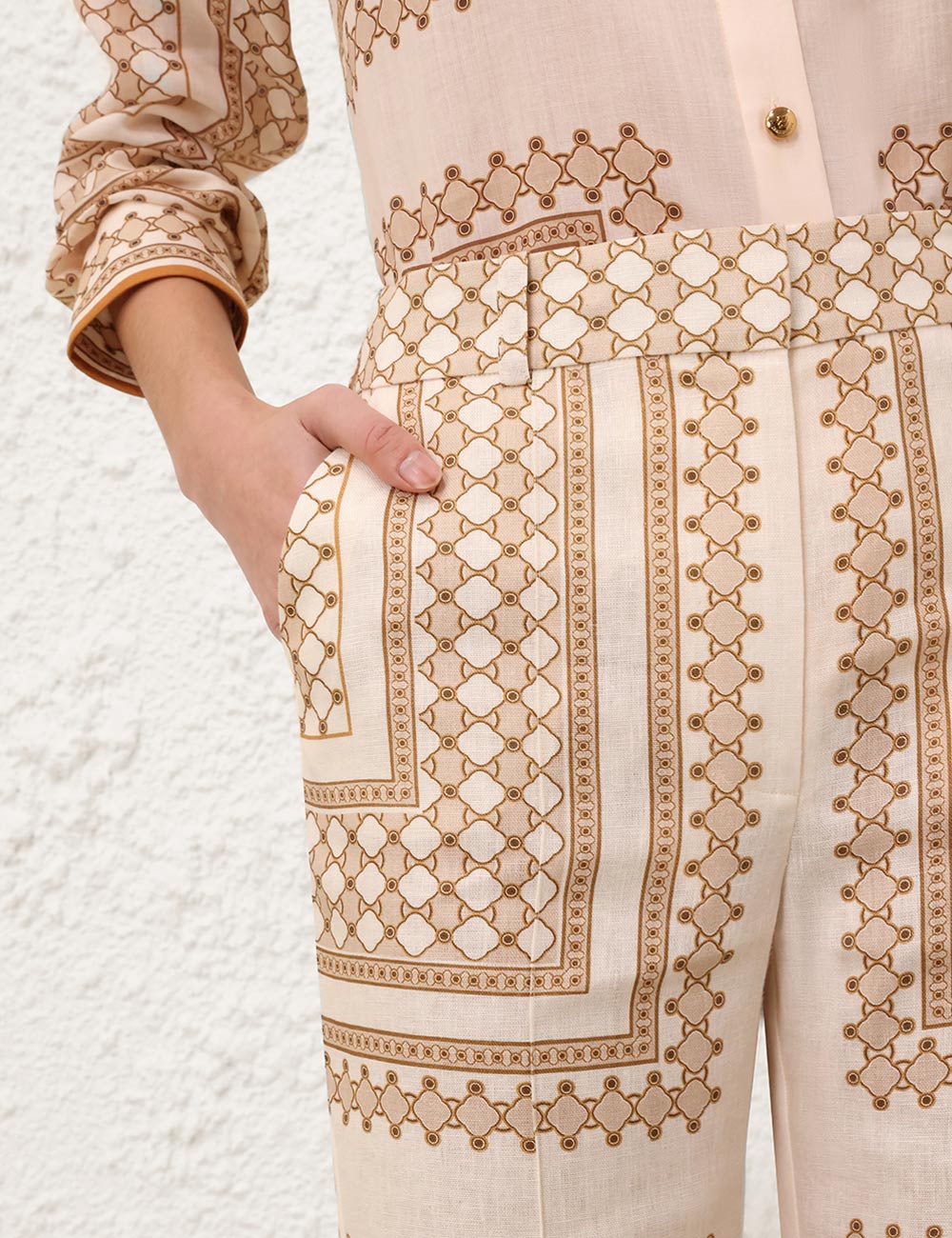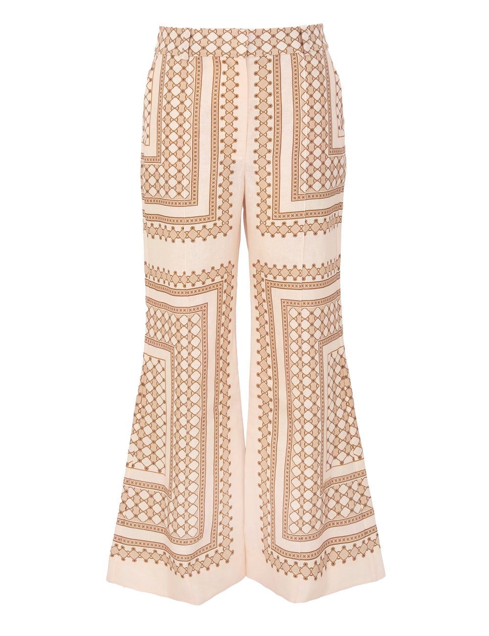 The Cropped Flare Pant in Cream Geo Print from our Fall 2025 Collection, Hypnotic. A linen high-rise pant featuring a fitted waistband with belt loops and a flared hem.100% linen fabric, wide leg trouser with clean finish waistband, zipper on centre front pant, slant pockets at front and side seam, welt back pockets