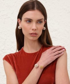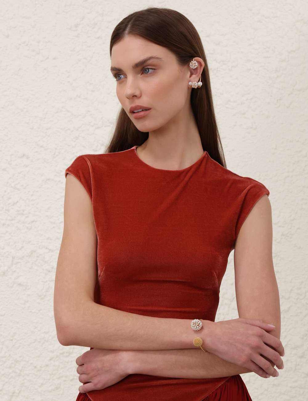 The Dandelion Cuff in Gold from our Fall 2025 Collection, Hypnotic. A gold plated wrist cuff featuring textured gold beads and tiny seed pearls.12kt gold plated wrist cuff, textured gold beads and seed pearls form floral-like clusters, glass pearl settings, slip on style, available in three sizes