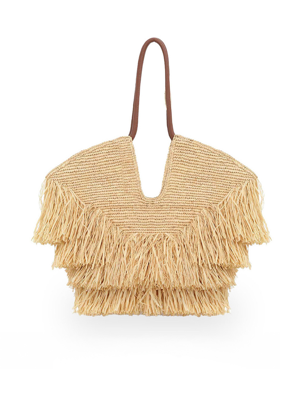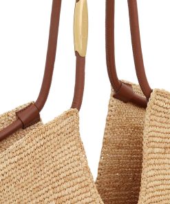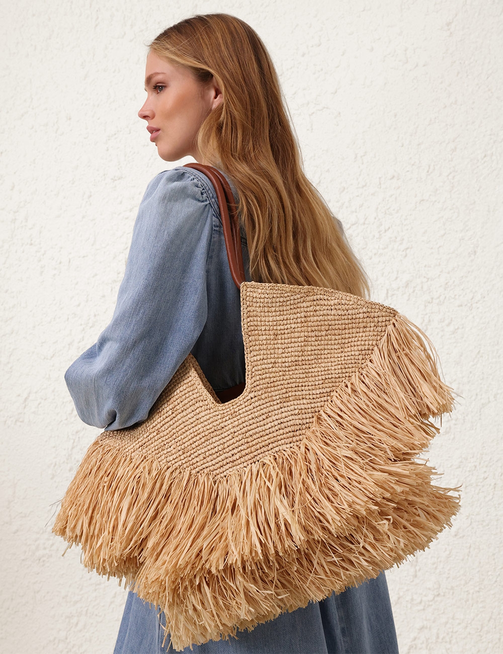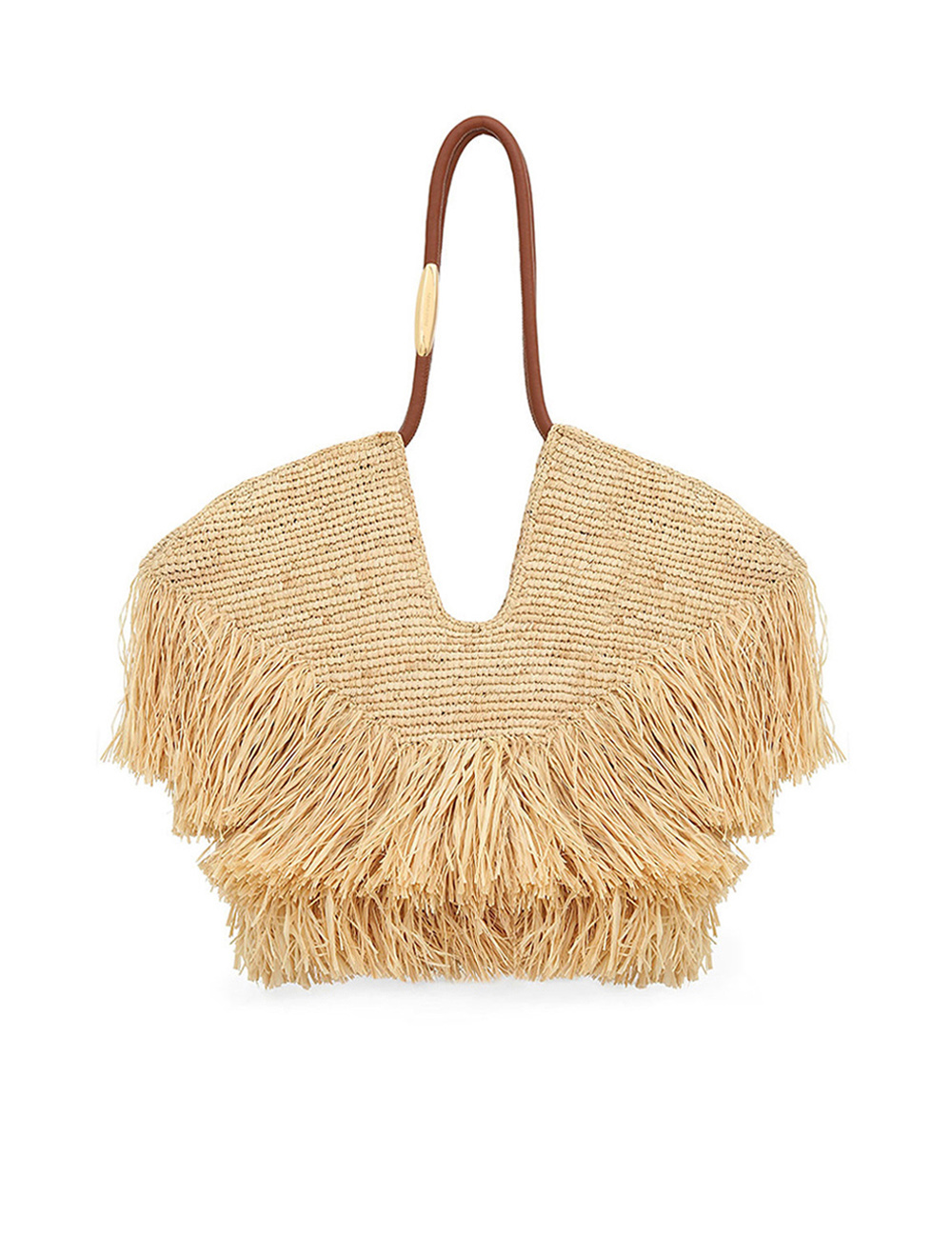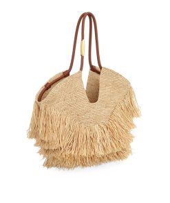 Handwoven in raffia, Goldentime is the perfect summer companion: its silhouette takes inspiration from the surf universe and the seascape organic shapes, while its infinite tubular handle is adorned with surfboard-inspired hardware. Trimmed with playful, handcut natural raffia fringes, Goldentime accommodates all summer essentials to transition effortlessly from beach to city. soft hand woven raffia, unlined, shoulder and hand-carry, made in madagascar