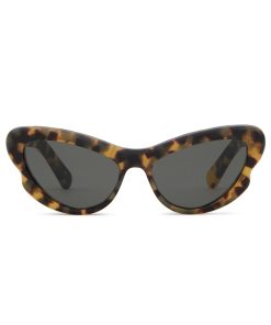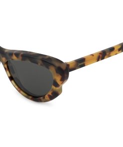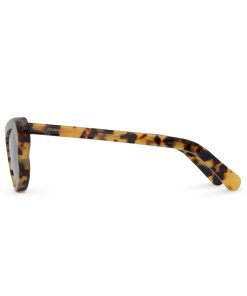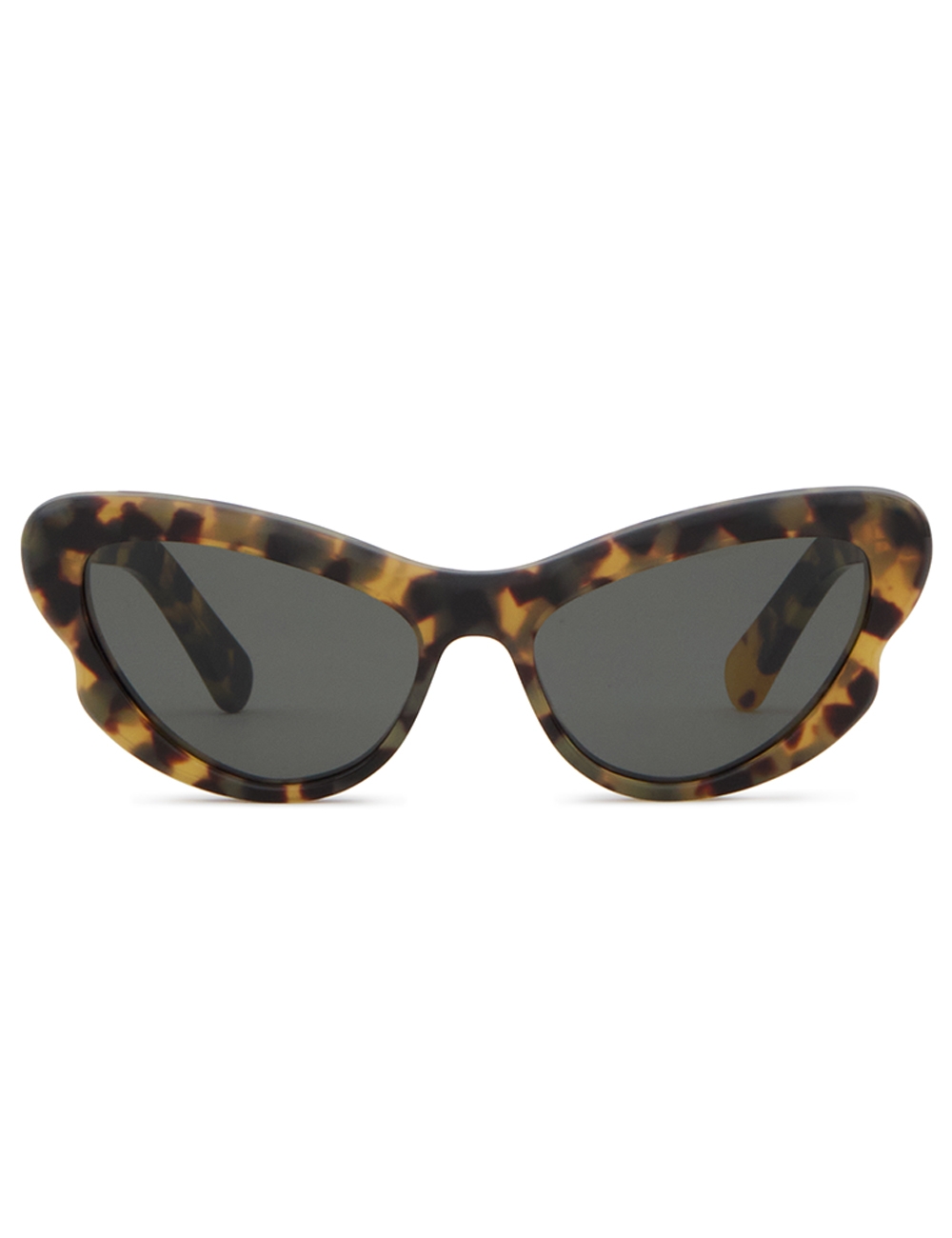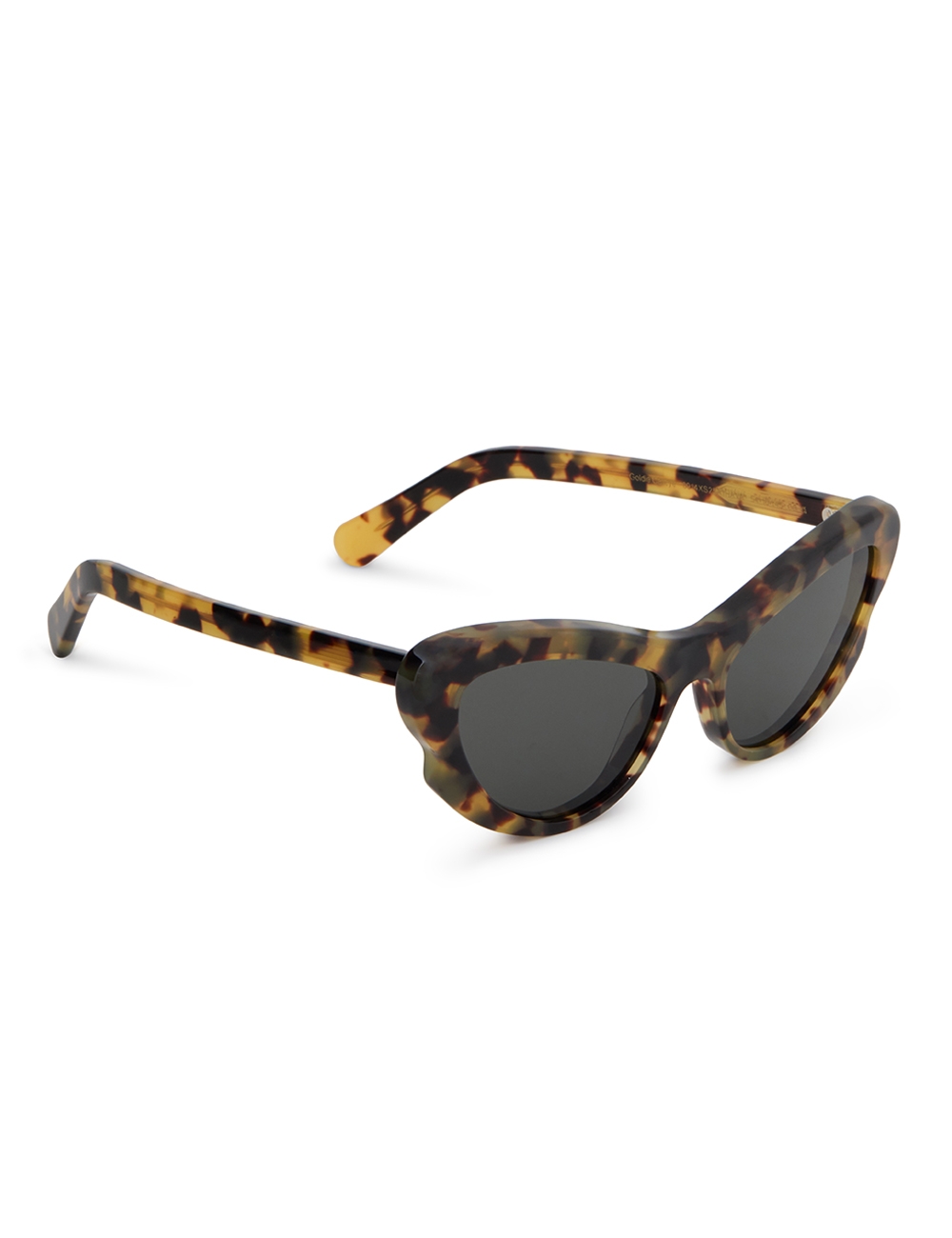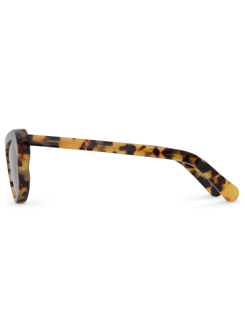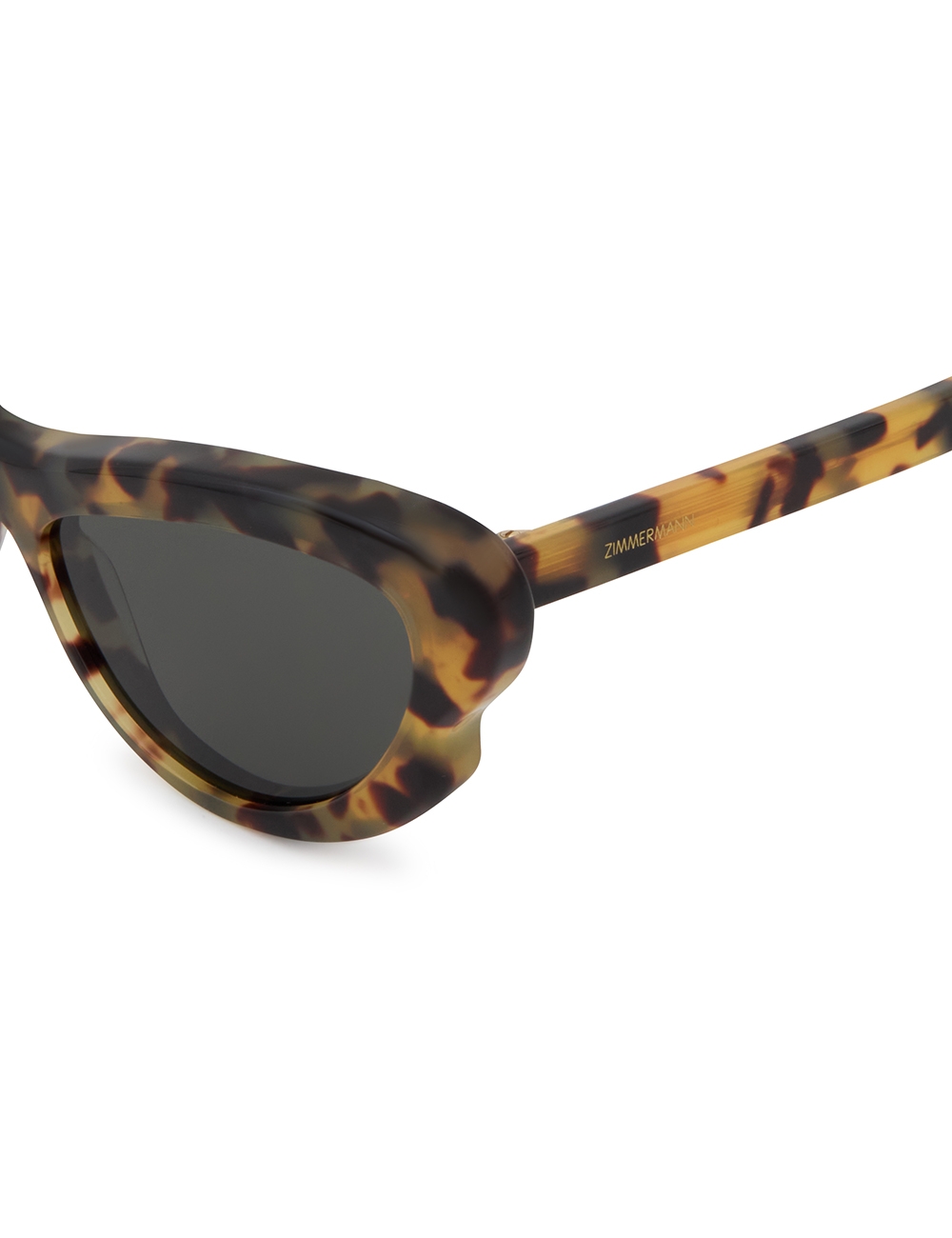 The Goldie Cateye in Havana from our Spring 2025 Collection, Illumination. An acetate curved frame featuring a classic cat eye shape and solid lenses. acetate frame, solid black lenses, temples feature a metal core for strength and durability, category 3 lenses, comes with zimmermann case, dust bag and storage box