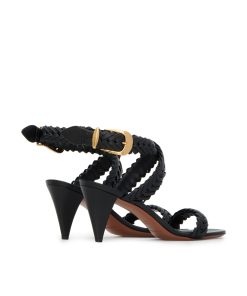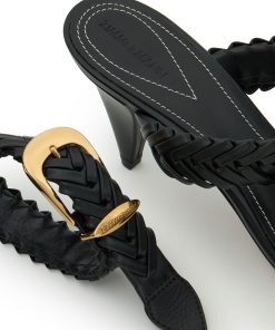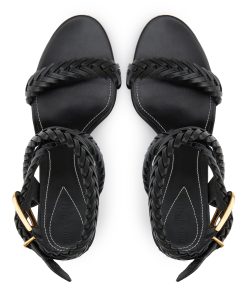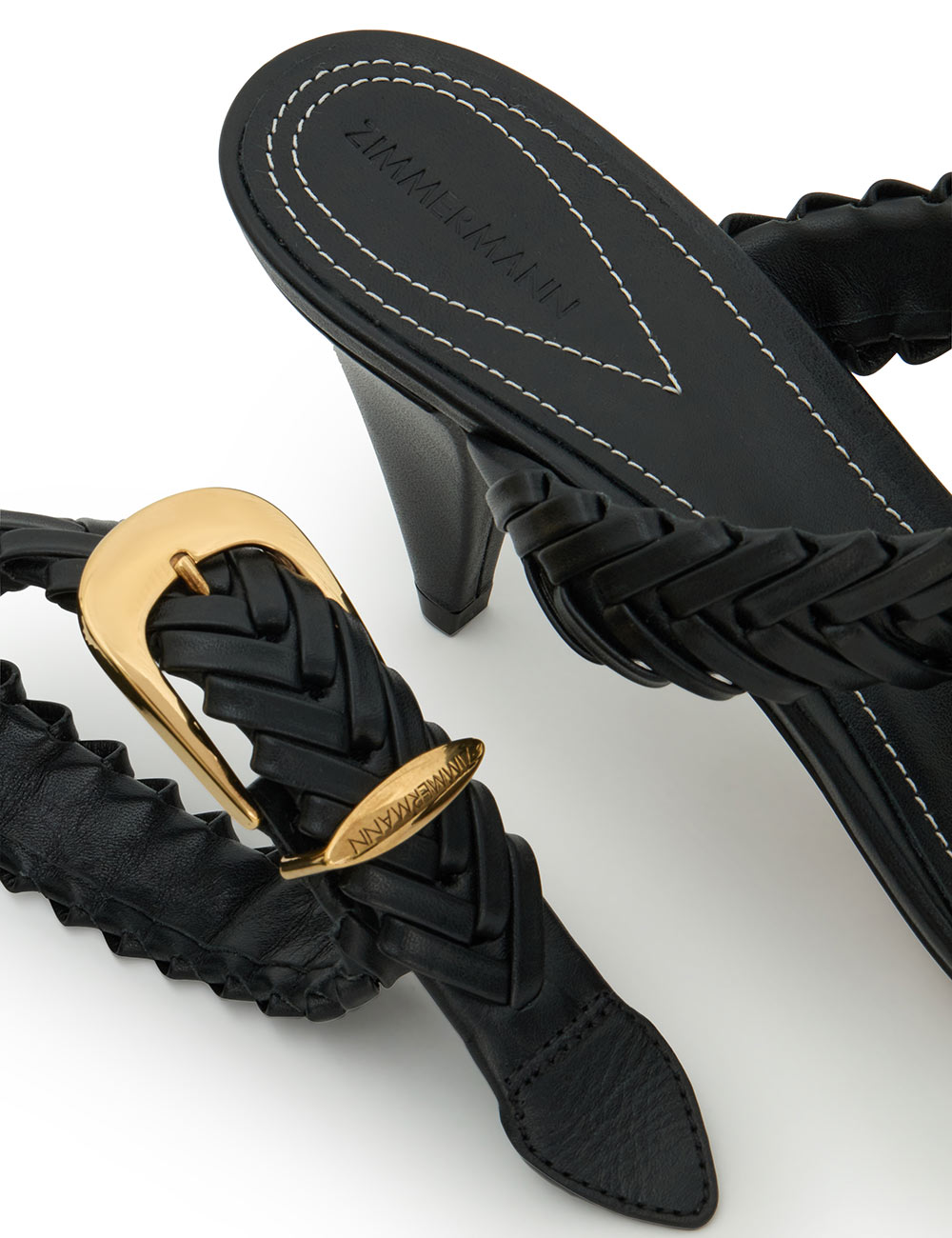The Helix Sandal 75 in Black from our Fall 2025 Collection, Hypnotic. Crafted in Italy, Helix features intricate braided weaving, elevated by custom gold hardware detailing. soft calfskin leather heel sandal, woven braided upper, round toe, adjustable ankle strap, 75mm conical woven heel, made in italy
