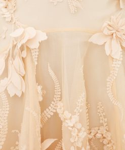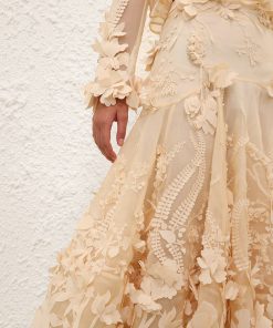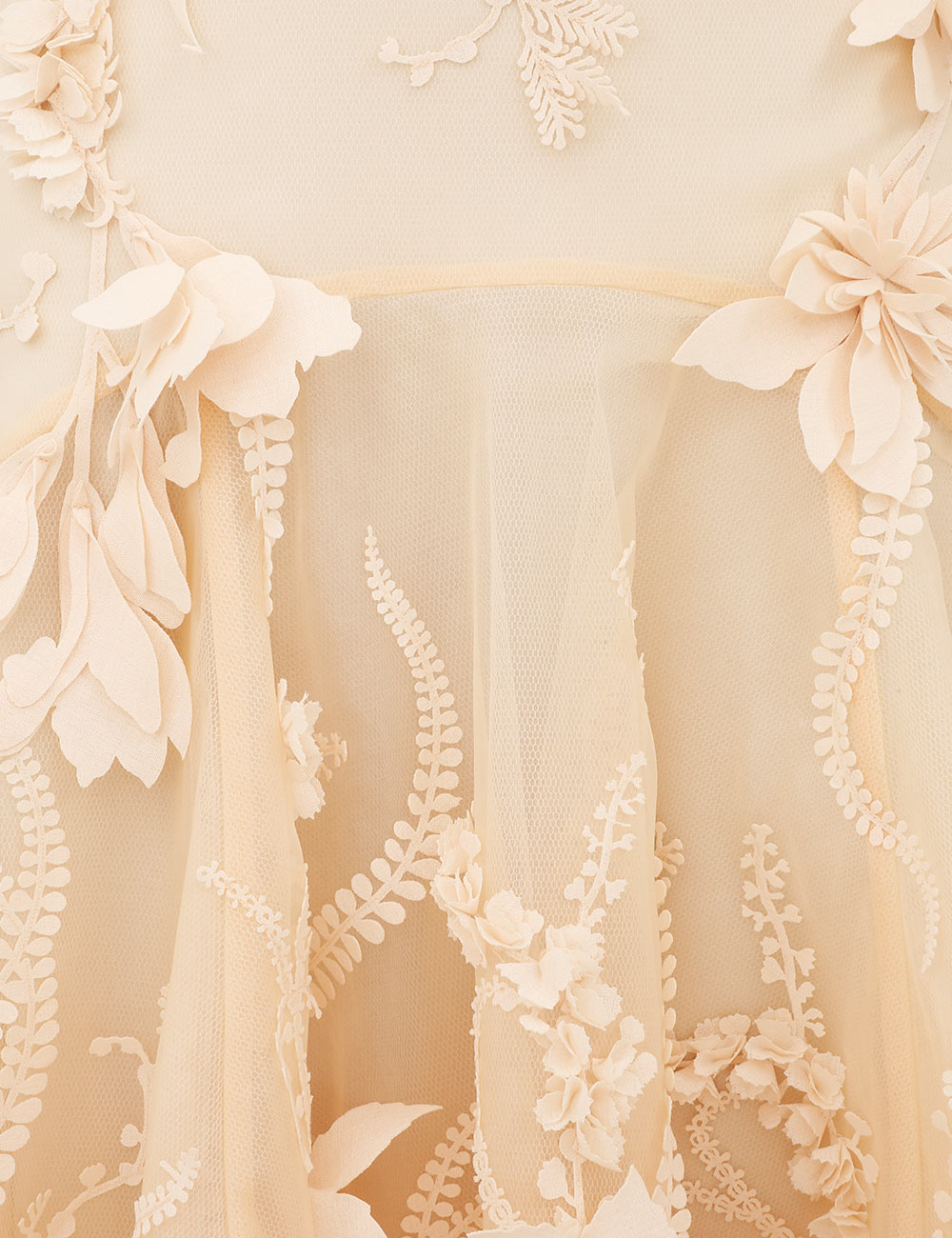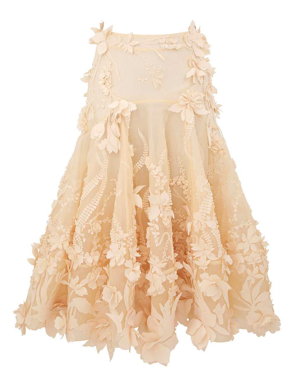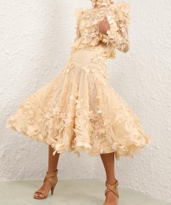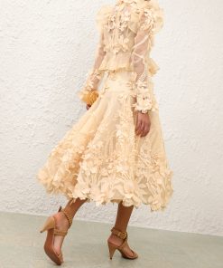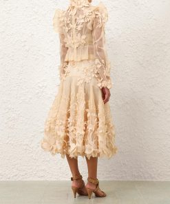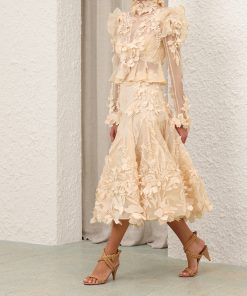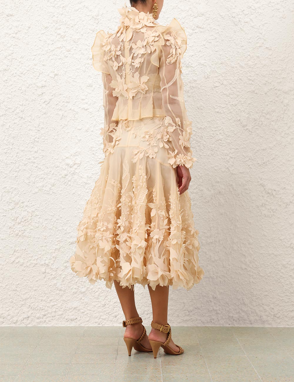 The Hypnotic Applique Midi Skirt in Cream from our Fall 2025 Collection, Hypnotic. An A-line full skirt featuring 3D flower applique detailing throughout. 100% silk fabric, high-waisted skirt with boning, laser-cut flower applique, invisible zip closure at centre back, tulle backing for added volume, fully lined