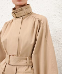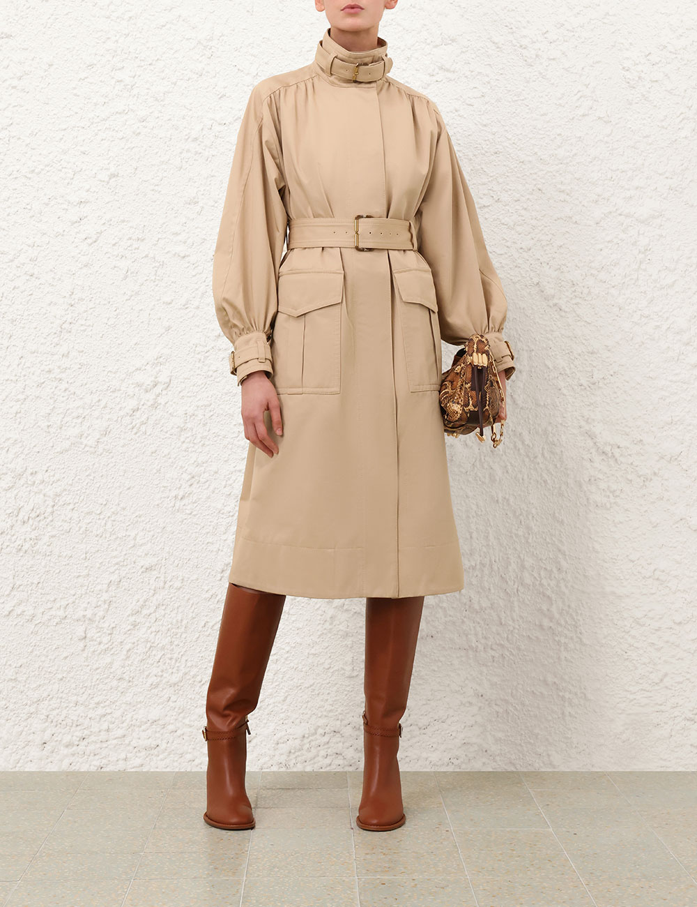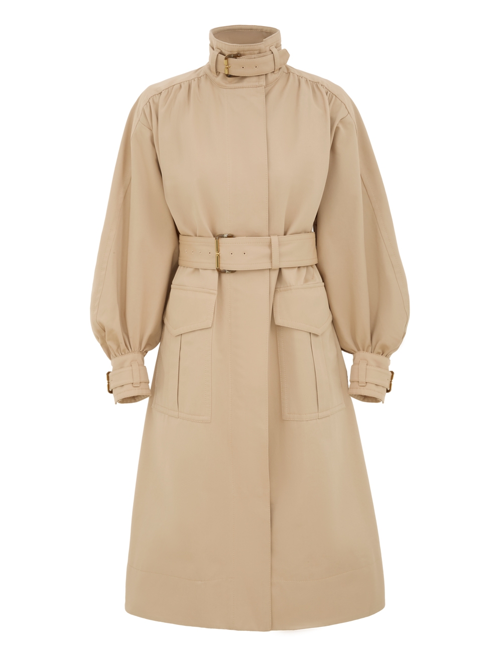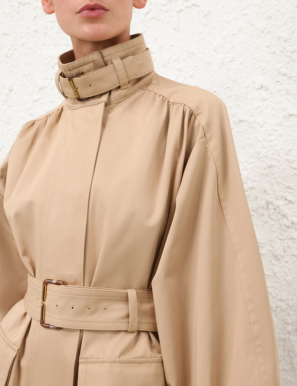 The Hypnotic Biker Trench Coat in Latte from our Fall 2025 Collection, Hypnotic. A biker trench coat featuring a high stand collar, concealed front zip with snap closures and functional front flap pockets.longline cotton trench coat, long blouson sleeves with elongated cuffs and buckle detail, stand collar with buckle strap detail, front flap pockets with snap closures, removable roller-buckle belt at the waist, centre back vent slit, fully lined