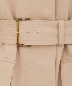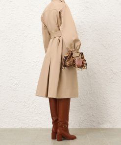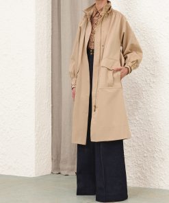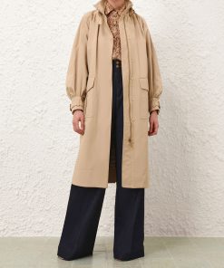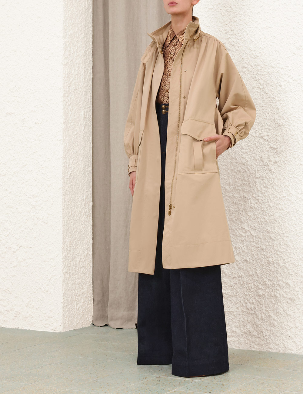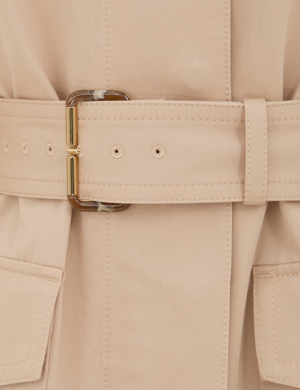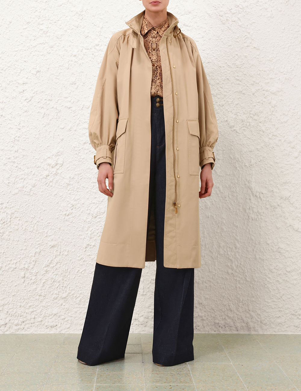 The Hypnotic Biker Trench Coat in Latte from our Fall 2025 Collection, Hypnotic. A biker trench coat featuring a high stand collar, concealed front zip with snap closures and functional front flap pockets.longline cotton trench coat, long blouson sleeves with elongated cuffs and buckle detail, stand collar with buckle strap detail, front flap pockets with snap closures, removable roller-buckle belt at the waist, centre back vent slit, fully lined
