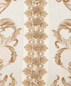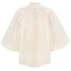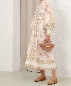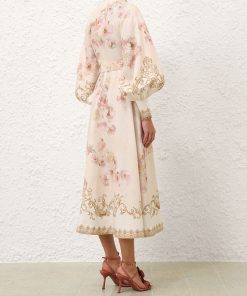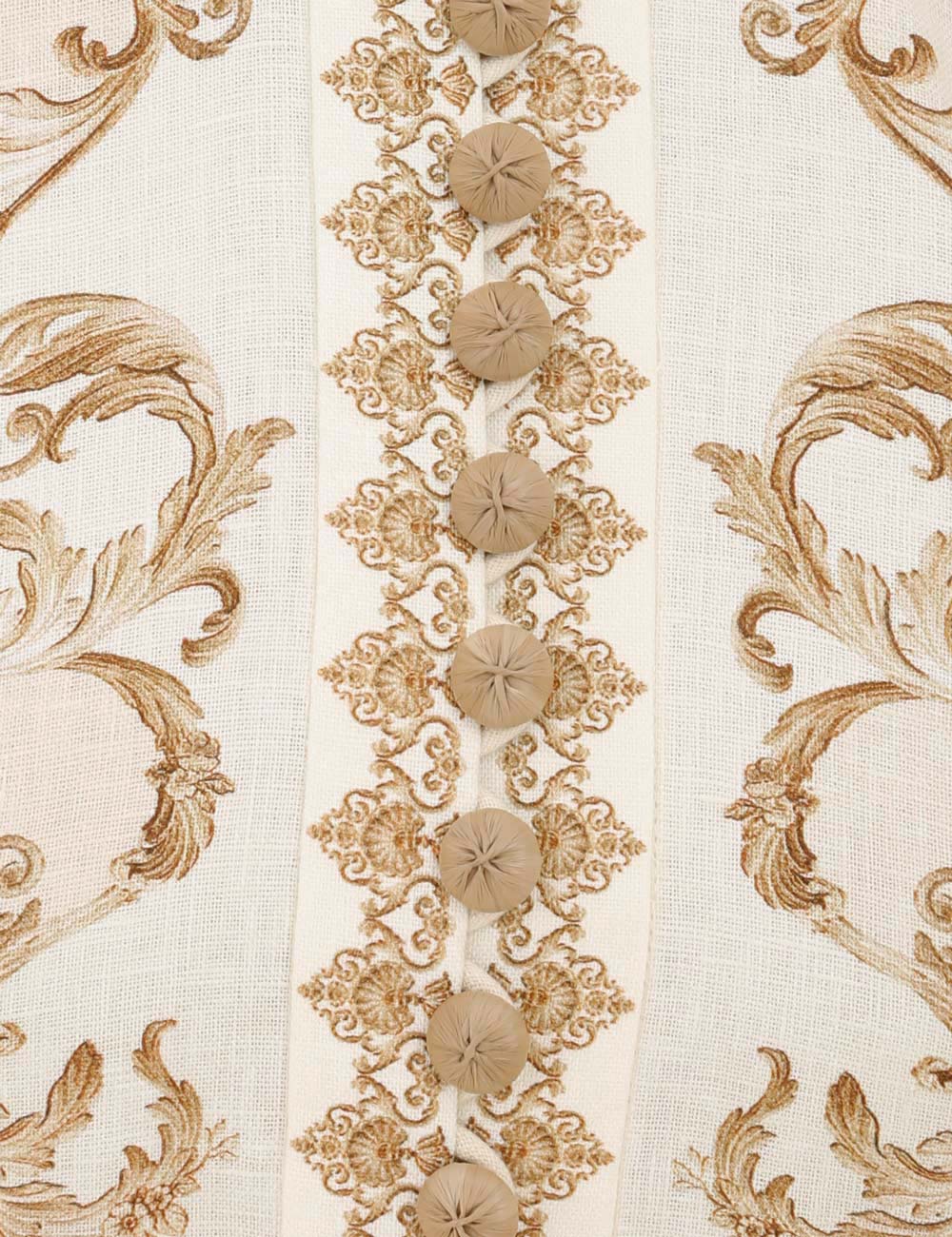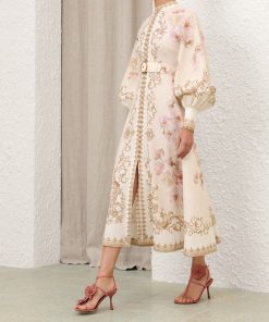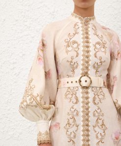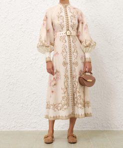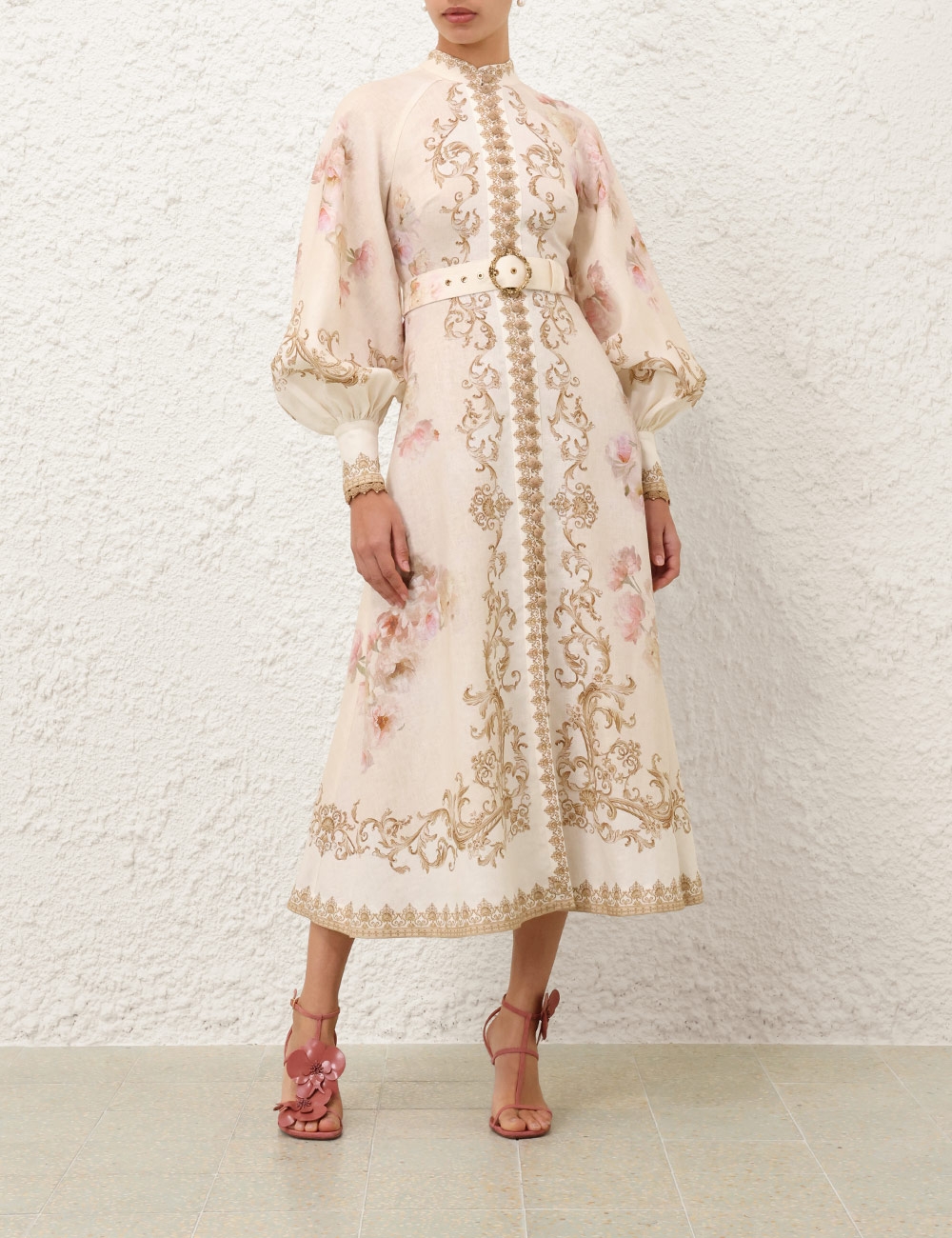 The Hypnotic Buttoned Midi Dress in Cream Peony from our Fall 2025 Collection, Hypnotic. A linen midi dress featuring long blouson sleeves with zippered cuffs, raffia buttons down the centre front and a removable self covered belt. 100% linen fabric, stand collar, functional centre front placket with rouleau button loops, removable buckle belt, invisible zip at centre back, raffia trim at cuffs