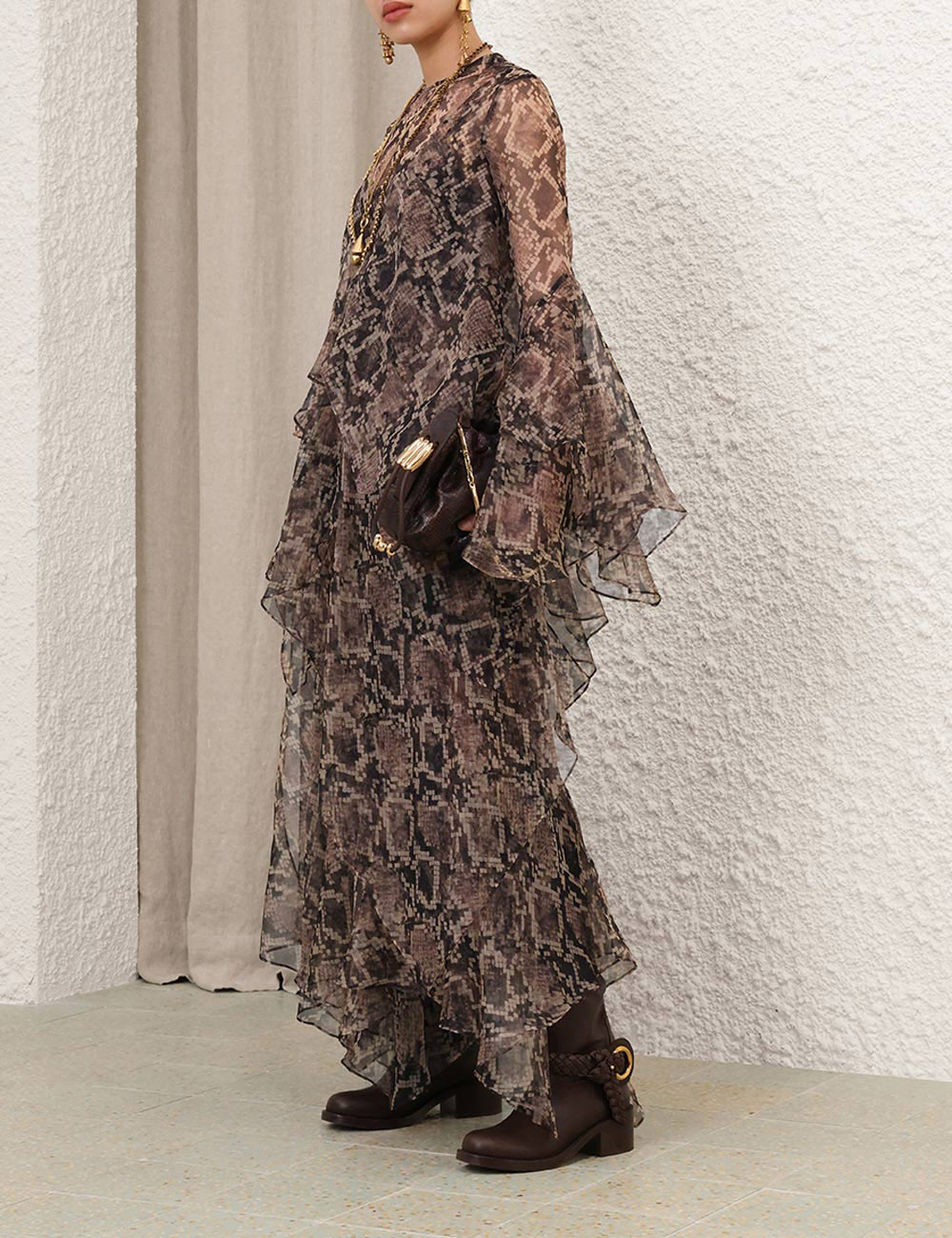 The Hypnotic Cascading Maxi Dress in Dark Snake from our Fall 2025 Collection, Hypnotic. A full-length silk organza dress featuring cascading ruffle layers and exaggerated sleeves. 100% silk fabric, cascading ruffles throughout, invisible zip closure at shoulders and left side seam, round neckline, sheer bodice, comes with separate slip