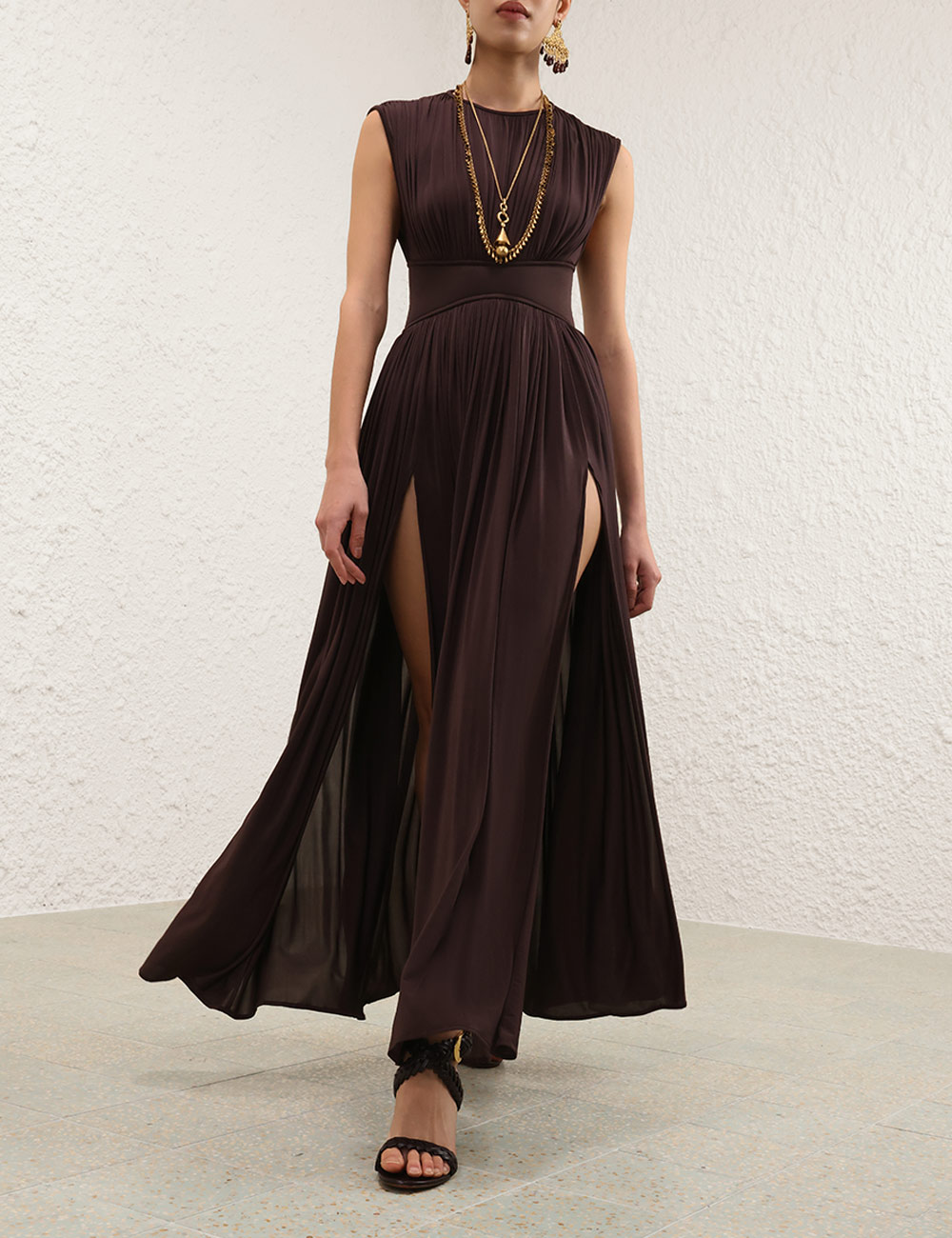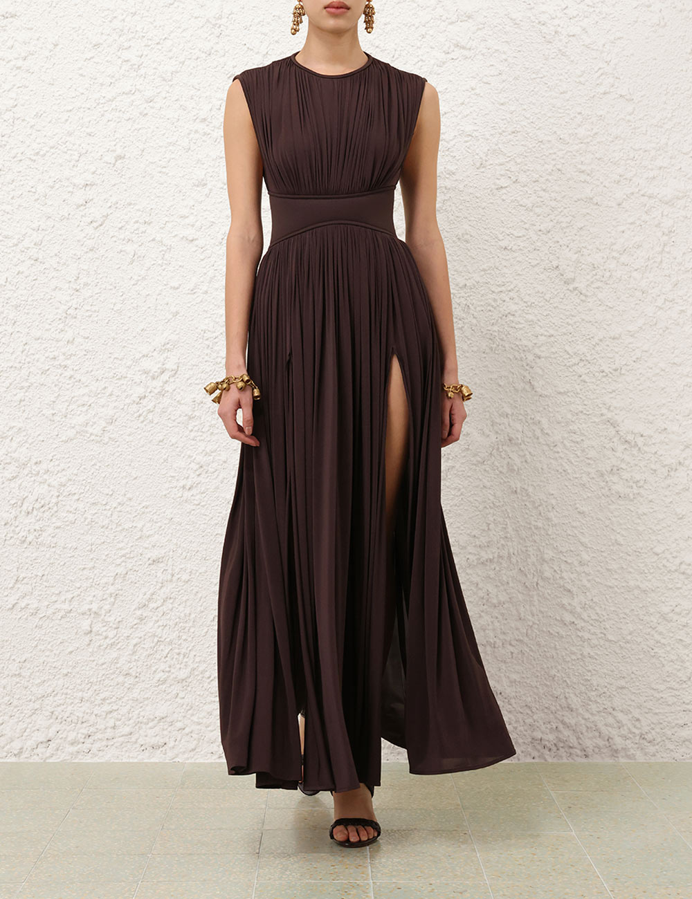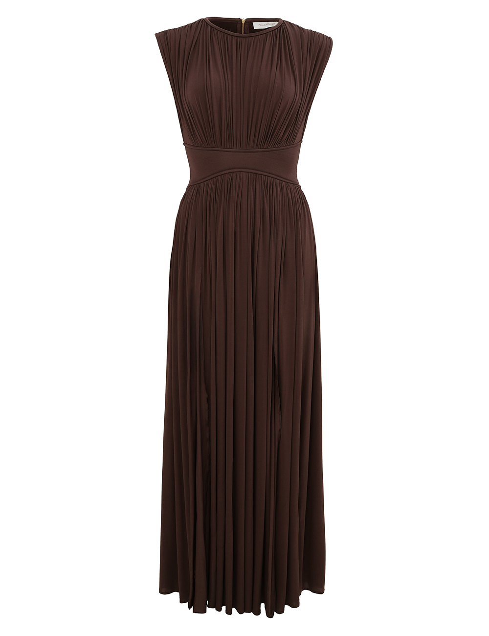 The Hypnotic Column Dress in Chocolate from our Fall 2025 Collection, Hypnotic. A maxi dress featuring a fixed waistband, heavy gathering at the neckline and waist, and front skirt splits, finished with a centre back zip.rounded neckline, front skirt splits, fixed waistband, gold metal zip at centre back, heavily pleated skirt with front splits
