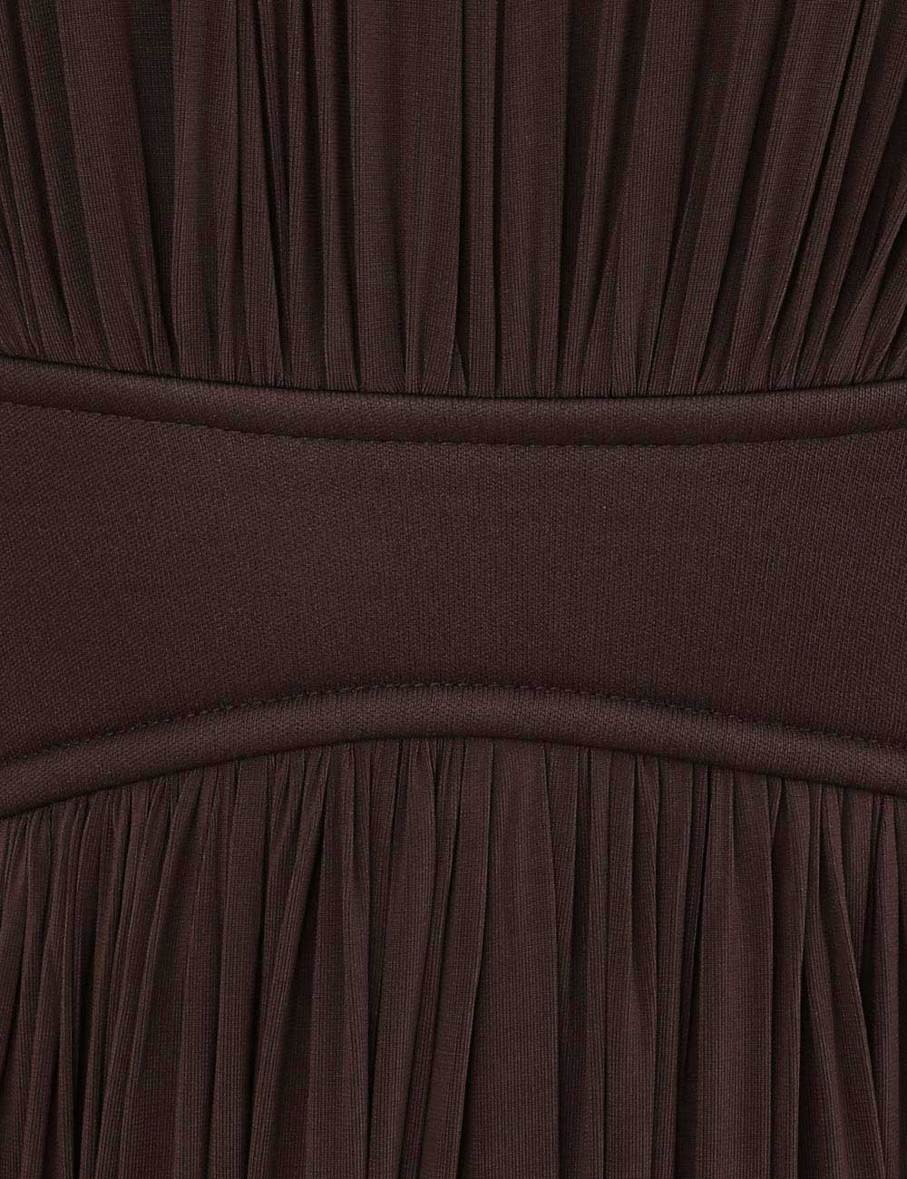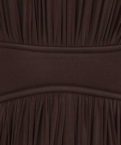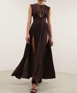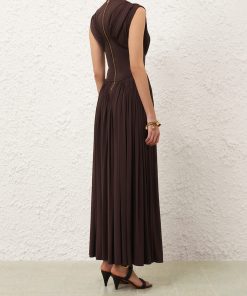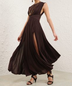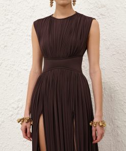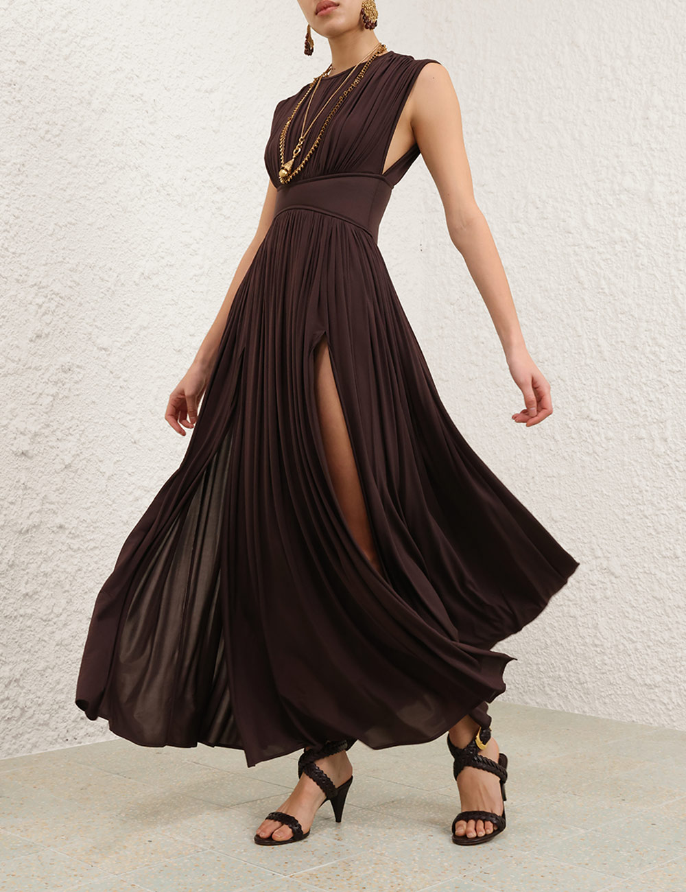 The Hypnotic Column Dress in Chocolate from our Fall 2025 Collection, Hypnotic. A maxi dress featuring a fixed waistband, heavy gathering at the neckline and waist, and front skirt splits, finished with a centre back zip.rounded neckline, front skirt splits, fixed waistband, gold metal zip at centre back, heavily pleated skirt with front splits