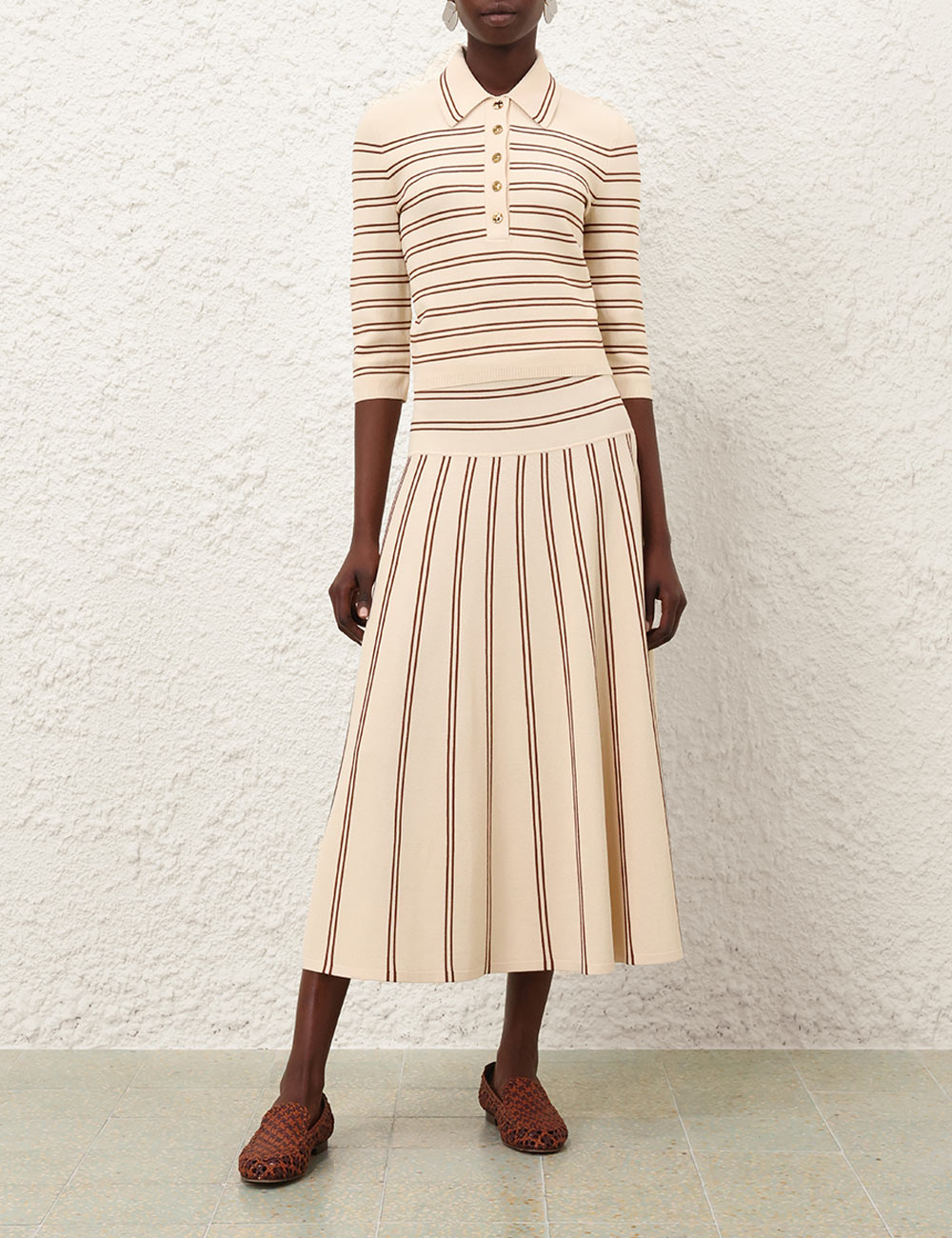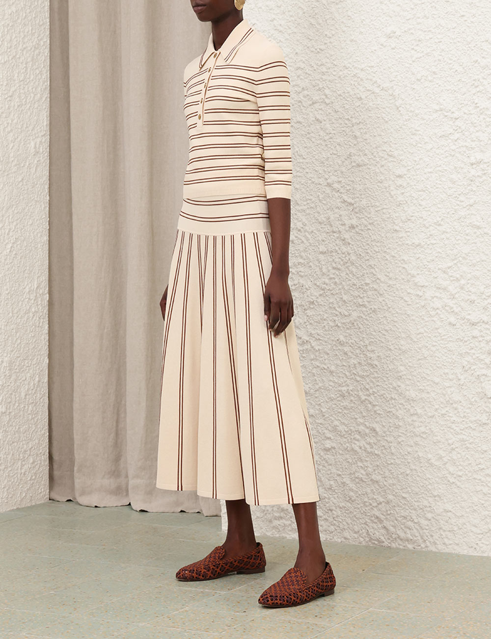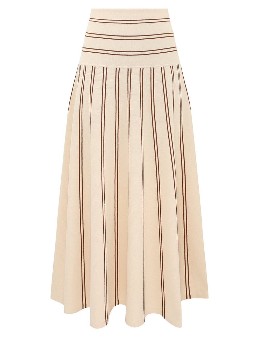 The Hypnotic Stripe Midi Skirt in Cream/Tan from our Fall 2025 Collection, Hypnotic. A knit midi skirt featuring contrast stripes, a thick elasticated waistband and a soft A-line silhouette.elasticated, mid-rise waist, slip on style, stripe pattern