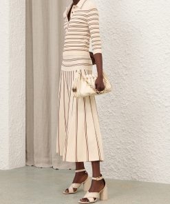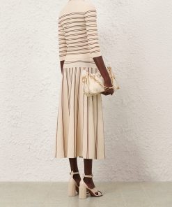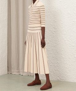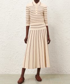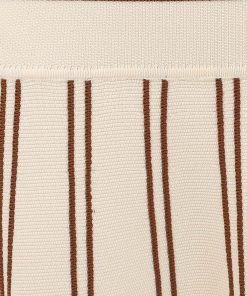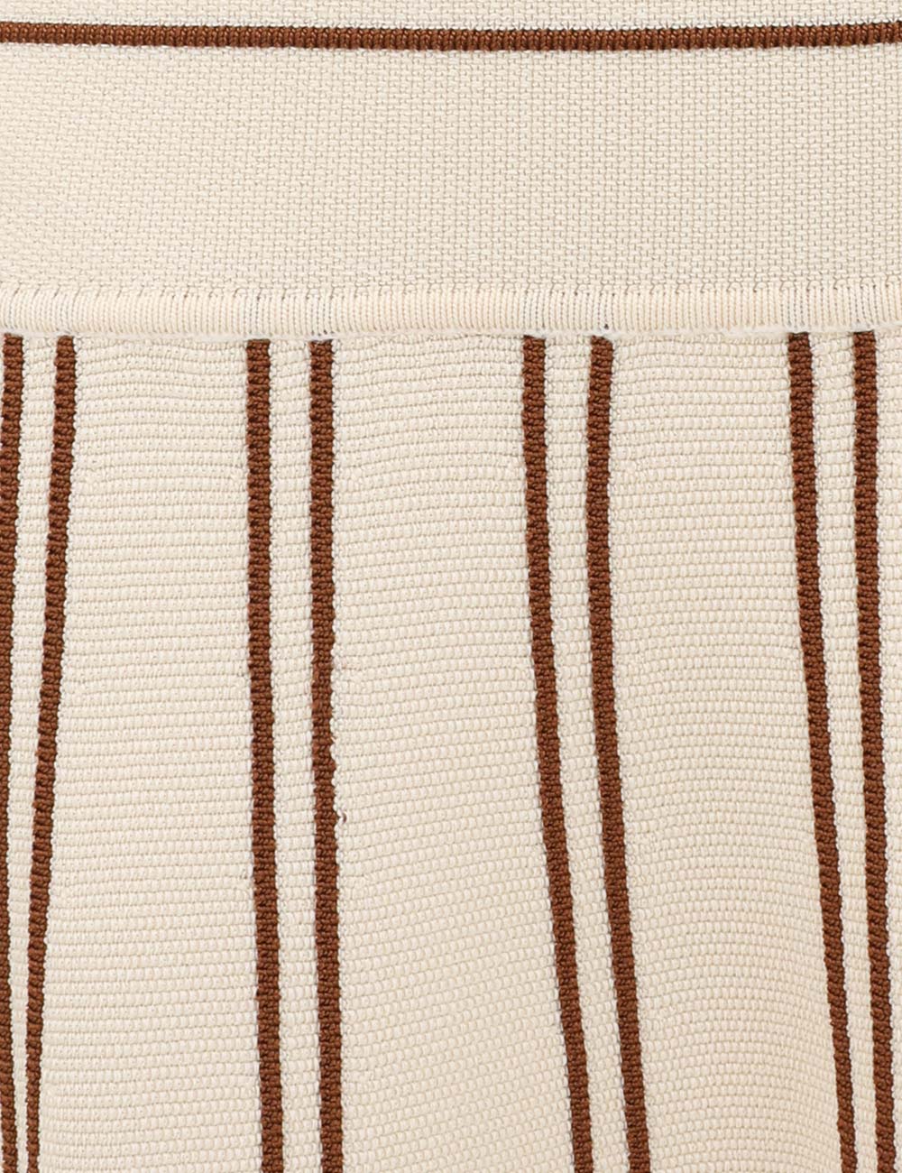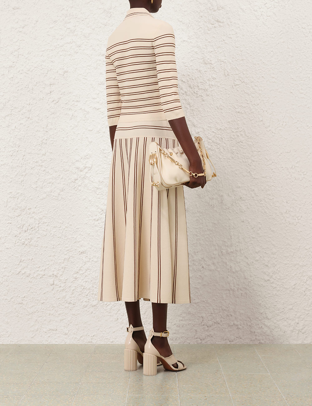The Hypnotic Stripe Midi Skirt in Cream/Tan from our Fall 2025 Collection, Hypnotic. A knit midi skirt featuring contrast stripes, a thick elasticated waistband and a soft A-line silhouette.elasticated, mid-rise waist, slip on style, stripe pattern