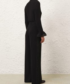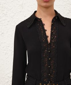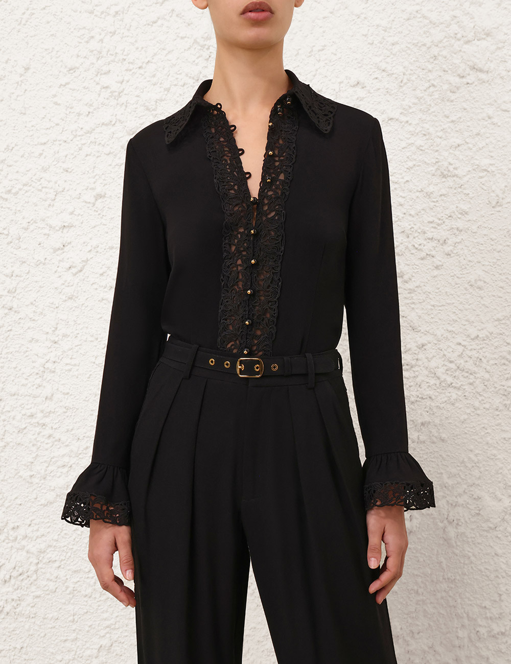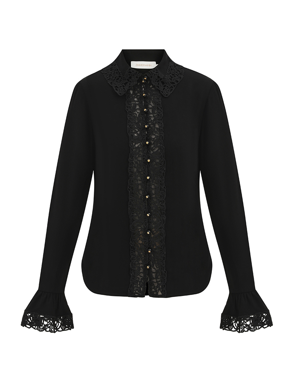 The Lace Trim Shirt in Black from our Fall 2025 Collection, Hypnotic. A fitted long sleeve shirt featuring a classic collar, frilled cuffs, buttons down the centre front, and lace trim throughout.lace trim at collar, centre front placket and cuffs, functional front buttons down the centre front, long sleeves with flared cuffs