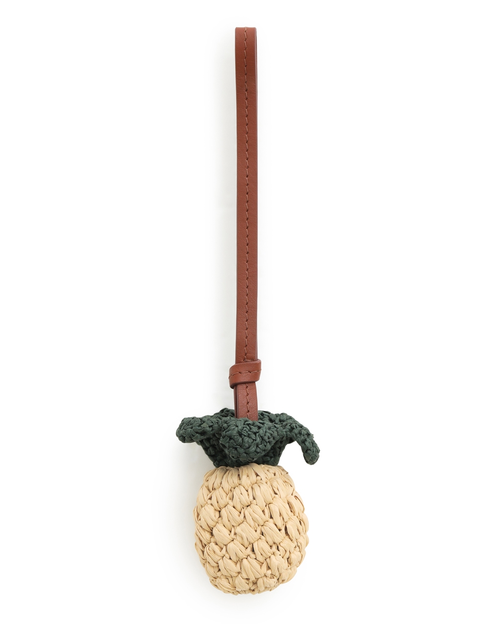 The Pineapple Raffia Bag Charm in Natural/Green from our Summer Swim 2025 Collection. A bag charm featuring a raffia pineapple design with gold plated hardware and leather strap. raffia pineapple design bag charm, leather strap, gold plated hardware
