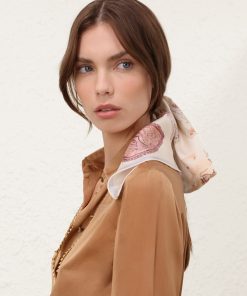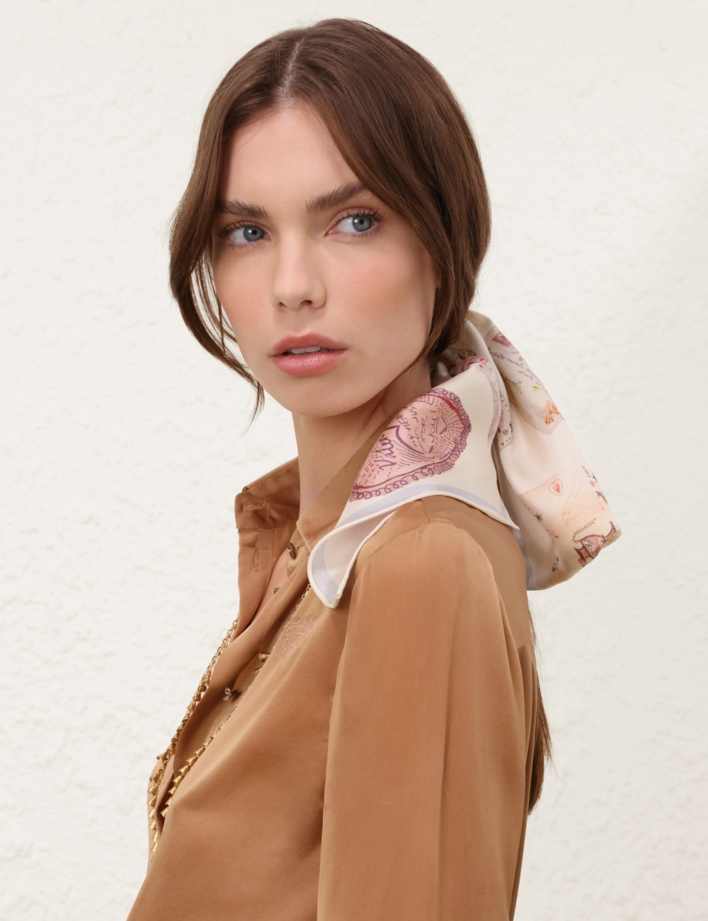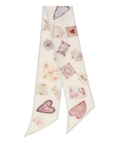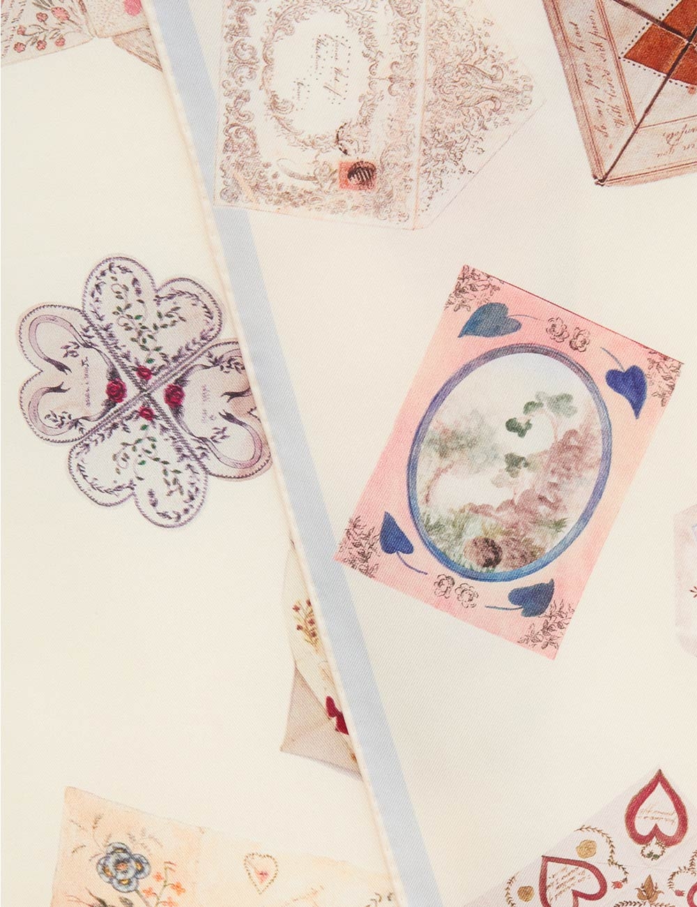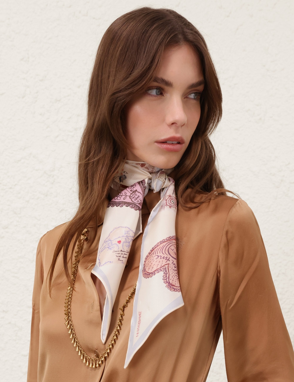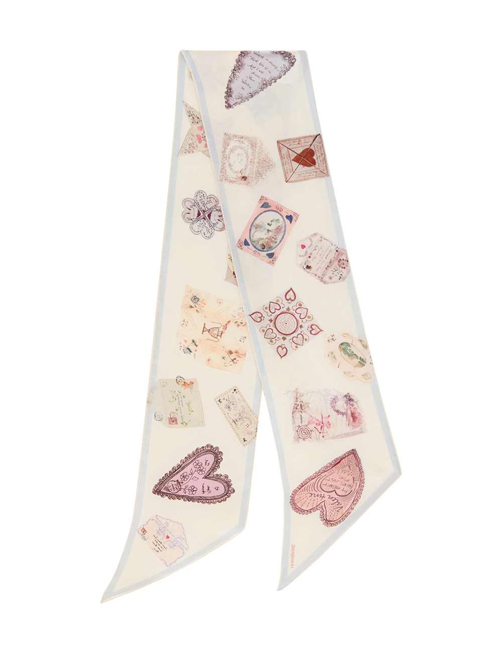 The Printed Silk Neck Scarf in Cream Love Letter from our Fall 2025 Collection, Hypnotic. A silk neck scarf featuring a customised placement print and fine rolled hem. 100% silk fabric, placement printed neck scarf