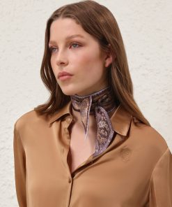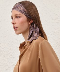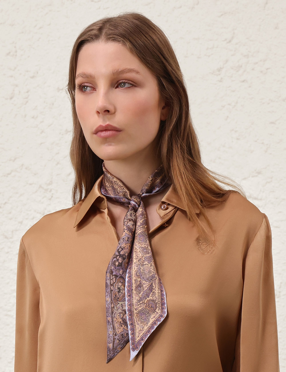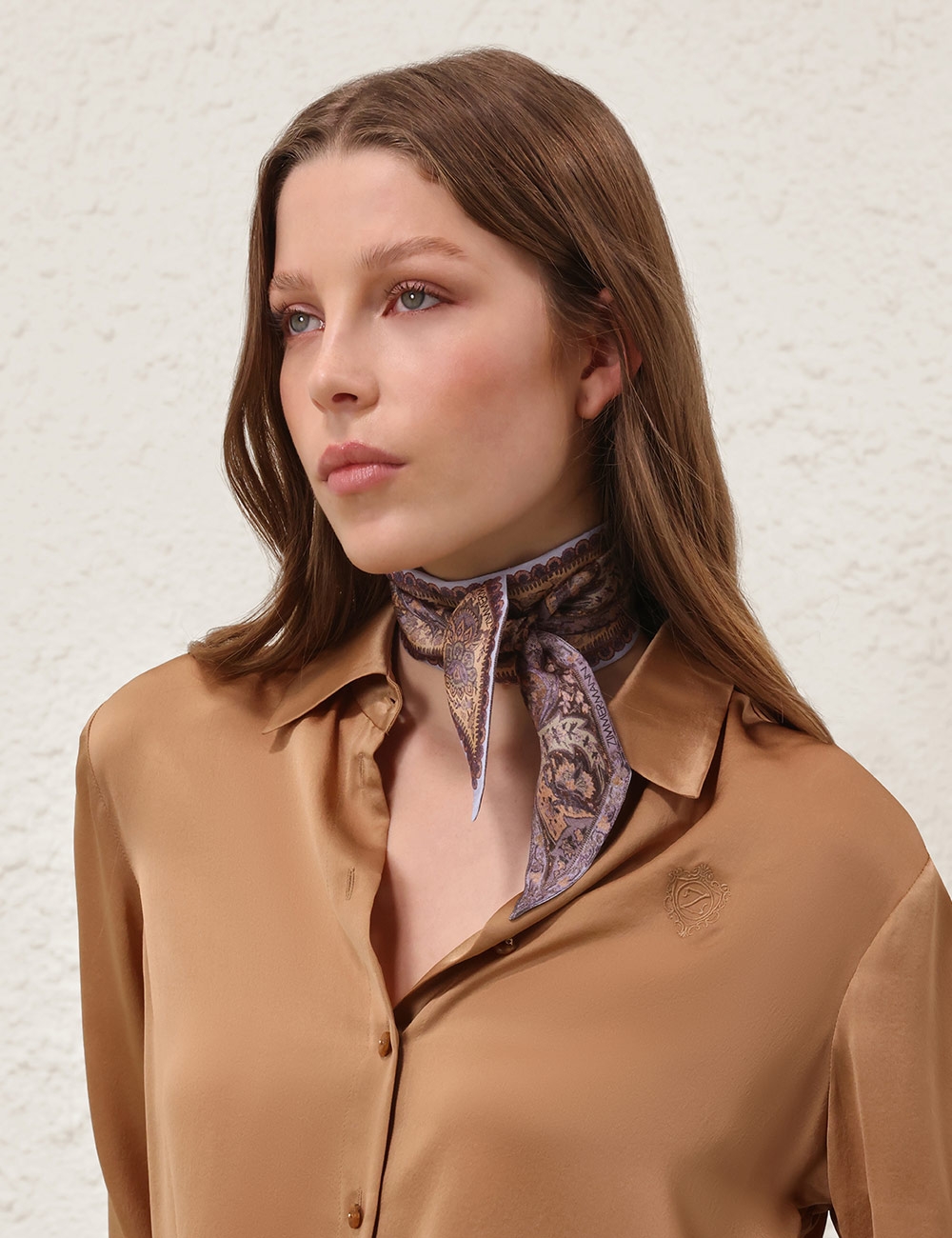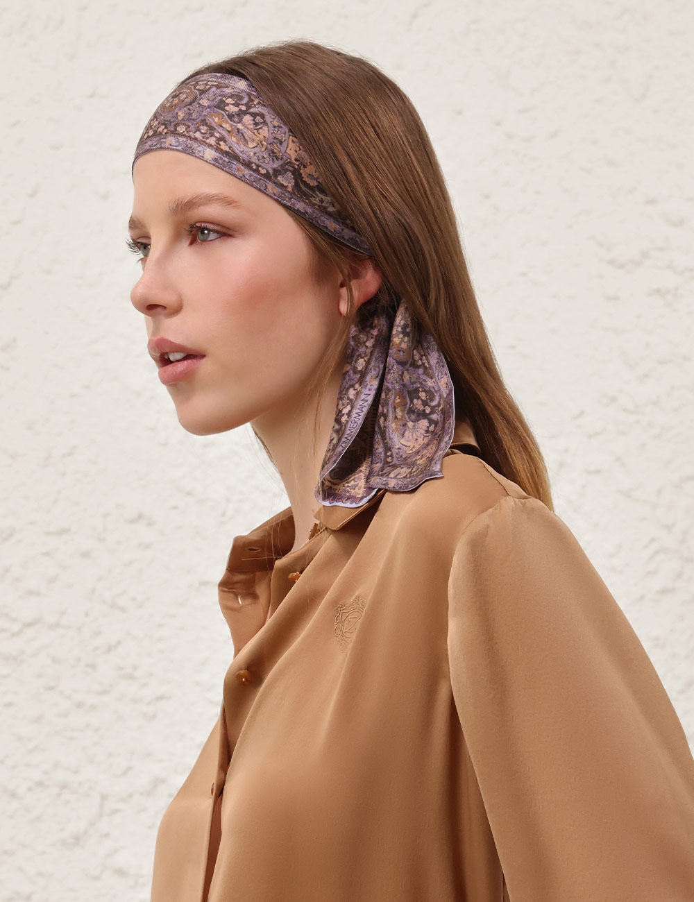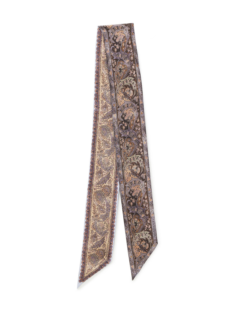 The Printed Silk Ribbon Scarf in Lilac Paisley from our Fall 2025 Collection, Hypnotic. A silk thin scarf featuring a contrast, custom print. 100% silk fabric, placement printed neck scarf