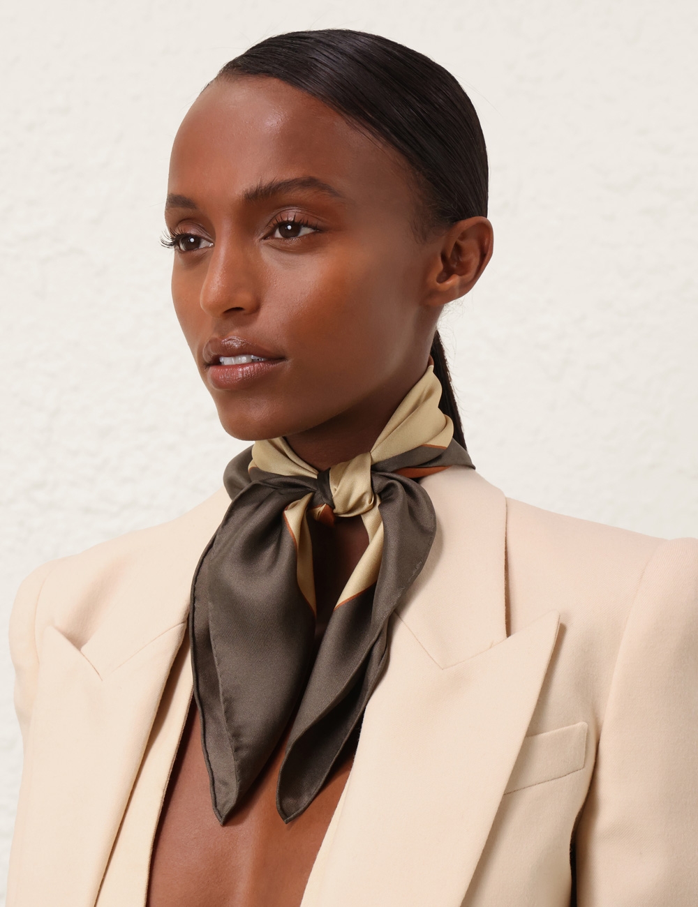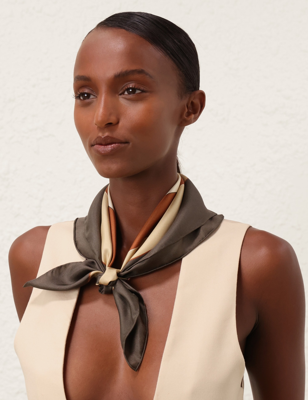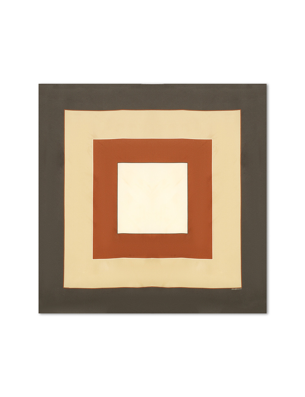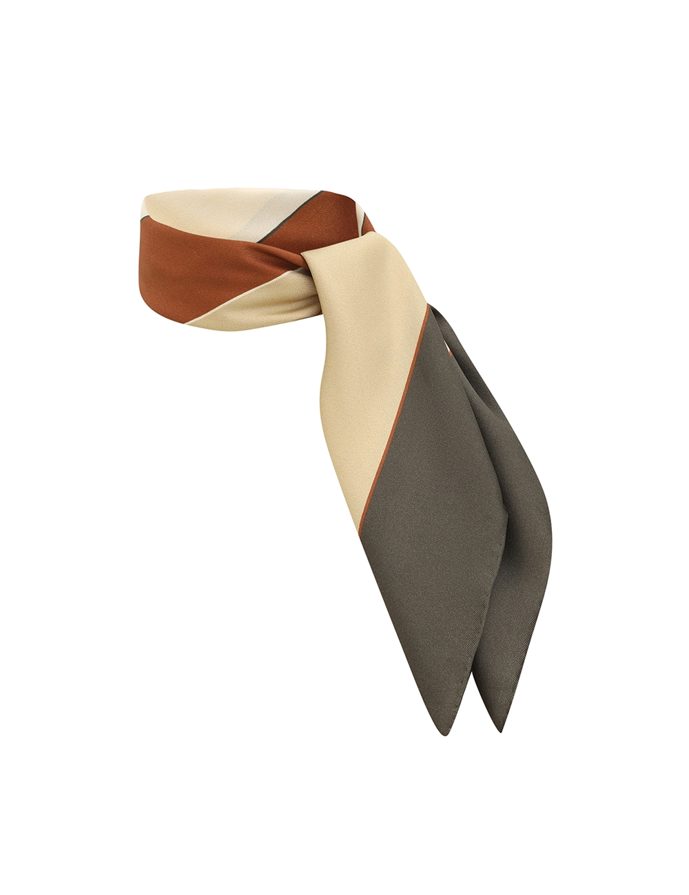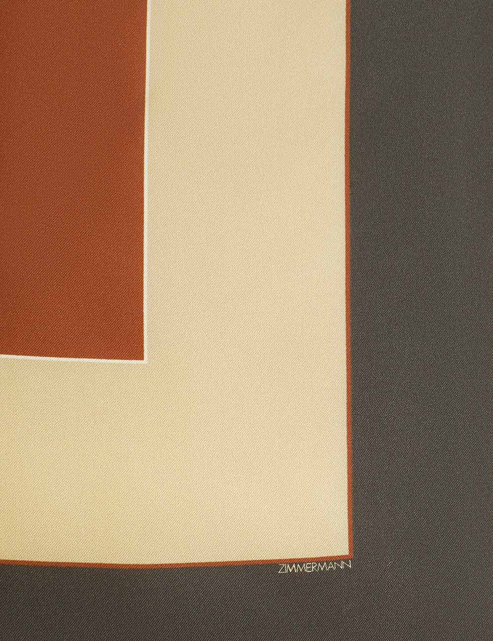 The Printed Silk Square 55 in Olive Geo from our Fall 2025 Collection, Hypnotic. A silk square scarf featuring a customised placement print and fine rolled hem.100% silk fabric, placement printed neck scarf