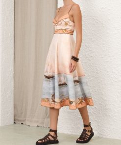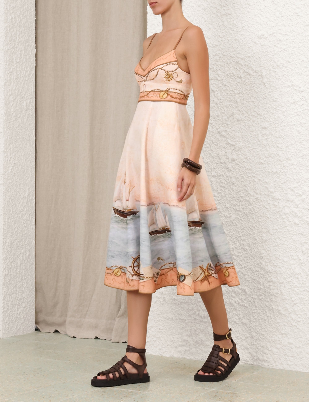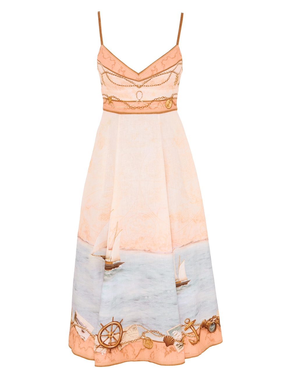 The Scarborough Picnic Midi Dress in Peach Nautical Map from our Summer Swim 2025 Collection. A linen midi dress featuring a V-neckline, shirred back, adjustable straps and a full flared skirt.100% linen fabric, contrasting piping and hem, adjustable straps for flexible fit, gathered bodice with fitted waistband, shirred elastic across centre back, invisible zip closure with hook and eye at centre back, side seam pockets