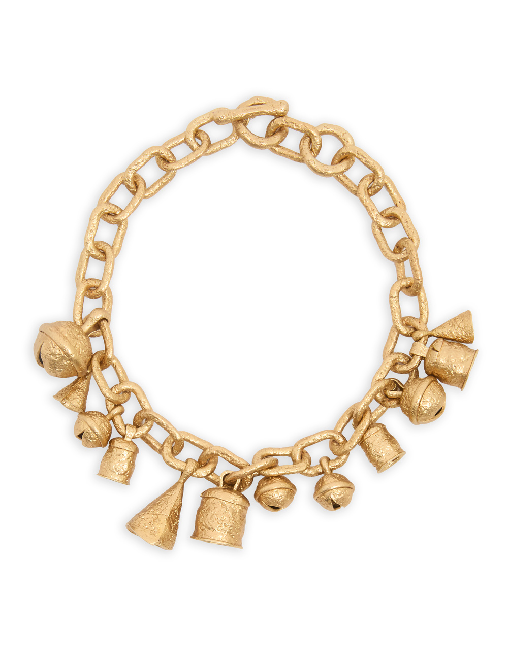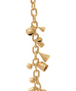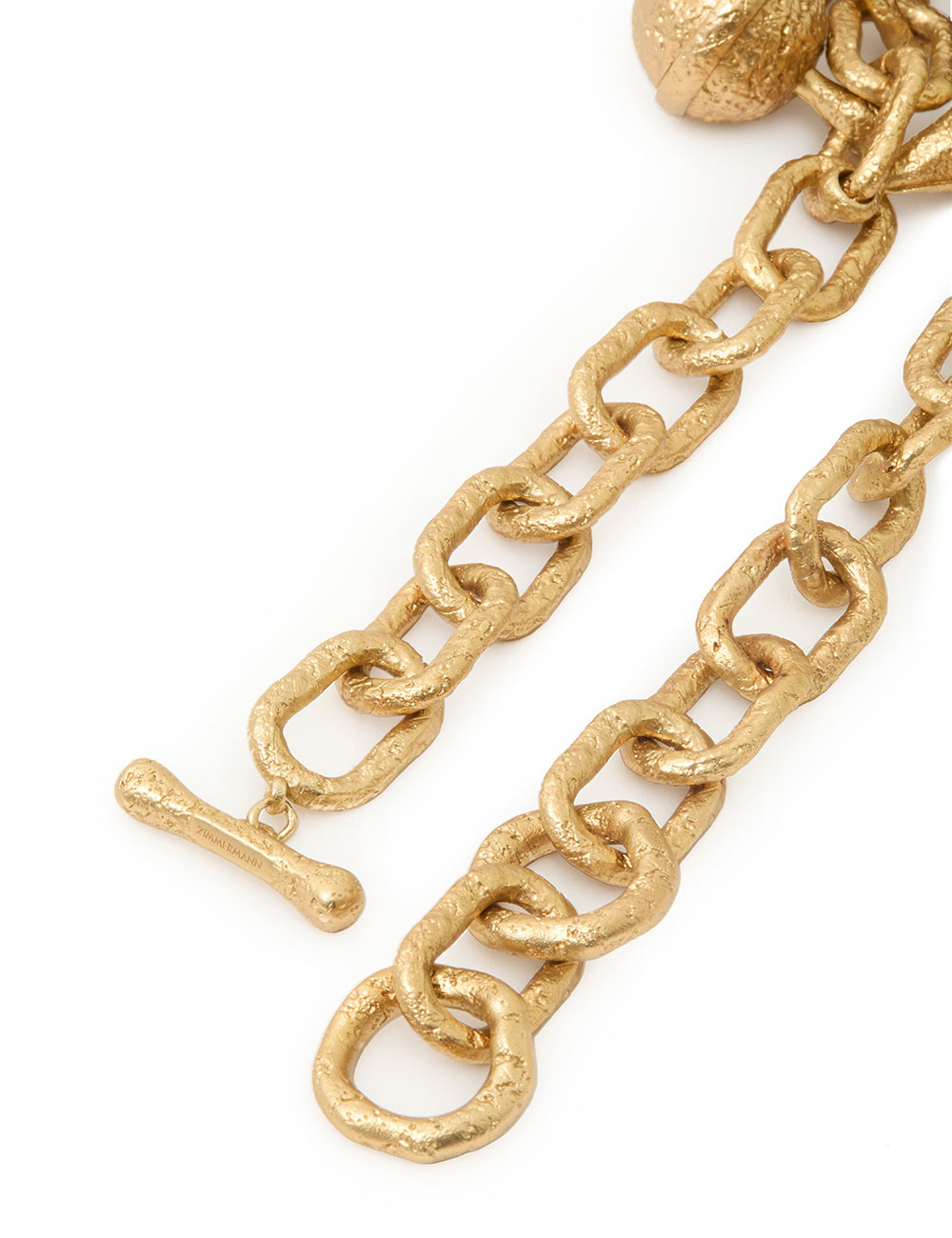 The Whimsy Charm Necklace in Antique Gold from our Fall 2025 Collection, Hypnotic. A gold plated chain necklace featuring alternating charms and a T-bar clasp.14kt gold plated brass necklace, delicate hammered charms with surface textures, custom branded t-bar clasp closure