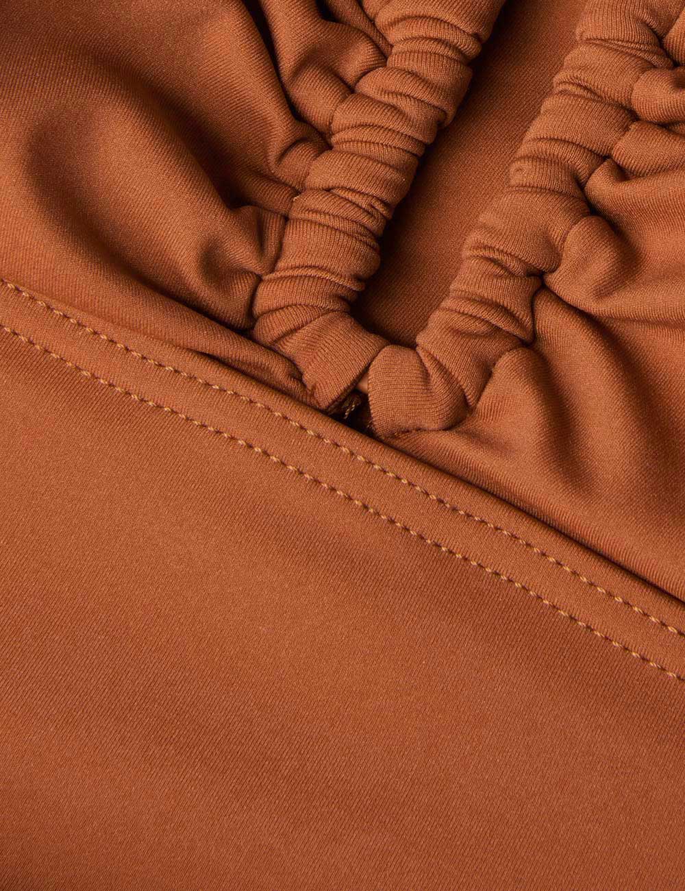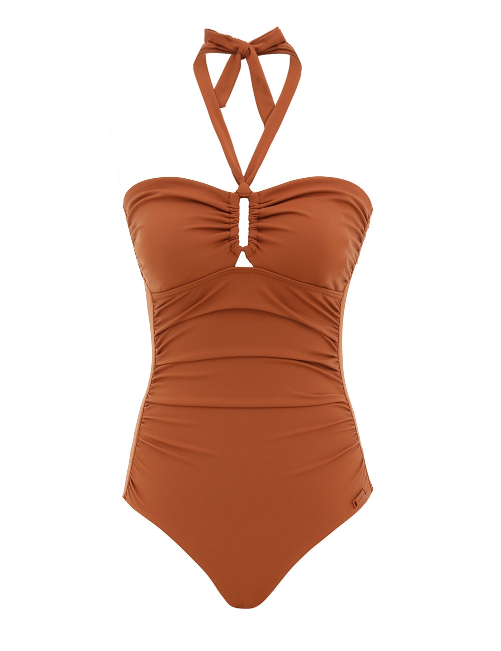 The Separates Wide Link 1PC in Tan from our Summer Swim 2025 Collection. A halter neck one piece with ruching throughout the body and wide link detail at centre bust. italian lycra, bandeau, halter one piece, full coverage bottoms, wide link detail at centre bust, removable cups, gripper elastic and boning for hold and bust support